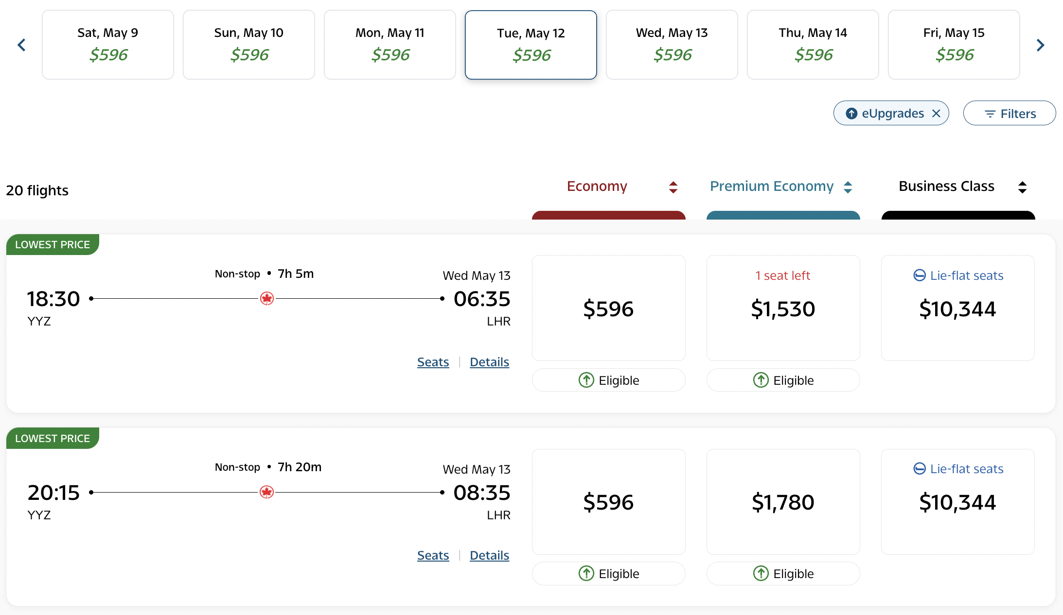 Once you’ve completed your search, click on the “eUpgrades” button at the top of the search results. The button looks the same on both cash and Aeroplan searches.