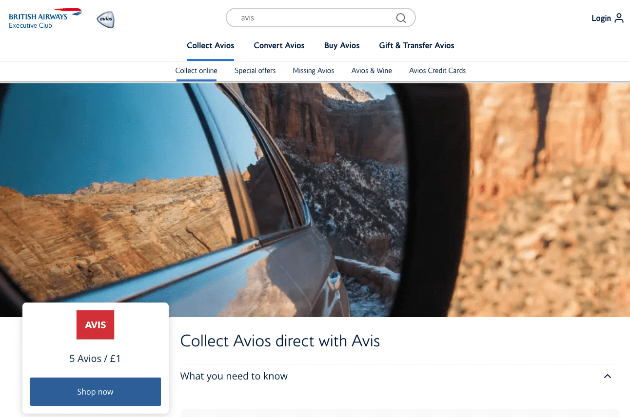 For example, through the British Airways Executive Club eStore, you can earn Avios by clicking their shopping link for AVIS car rentals and making a reservation, or by making a booking through Airbnb. This is an easy way to keep your points active while booking essential services like car rentals or short-term rentals.