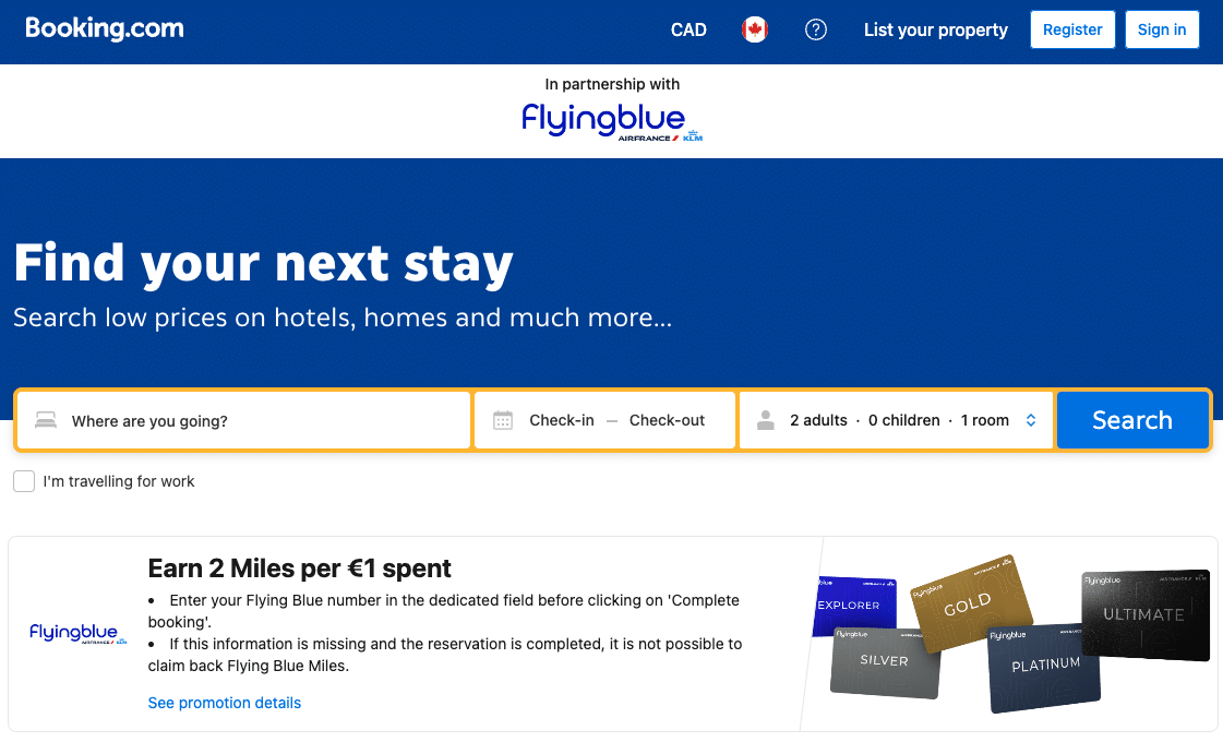 For instance, Air France KLM Flying Blue has partnered with Booking.com, allowing you to earn 2 Flying Blue miles per euro spent on hotel bookings when you go through the airline’s booking portal.
