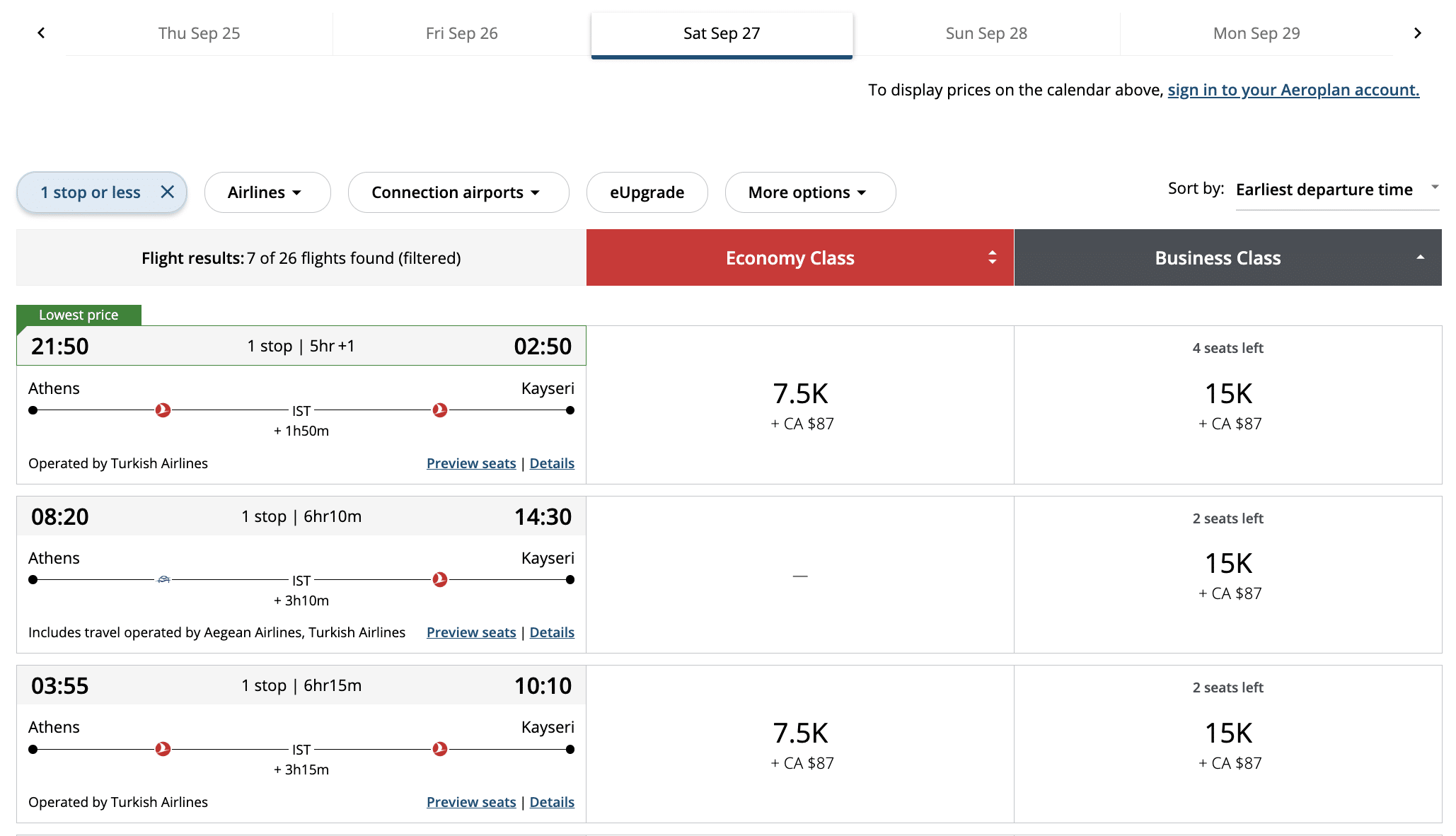 To reach Kayseri, you’ll need to book a flight from Istanbul (IST). However, if you search flights between Istanbul and Kayseri, you’ll find no Aeroplan availability on any date.
