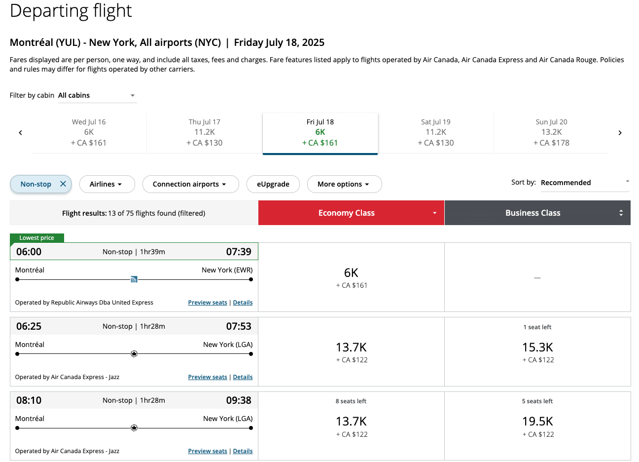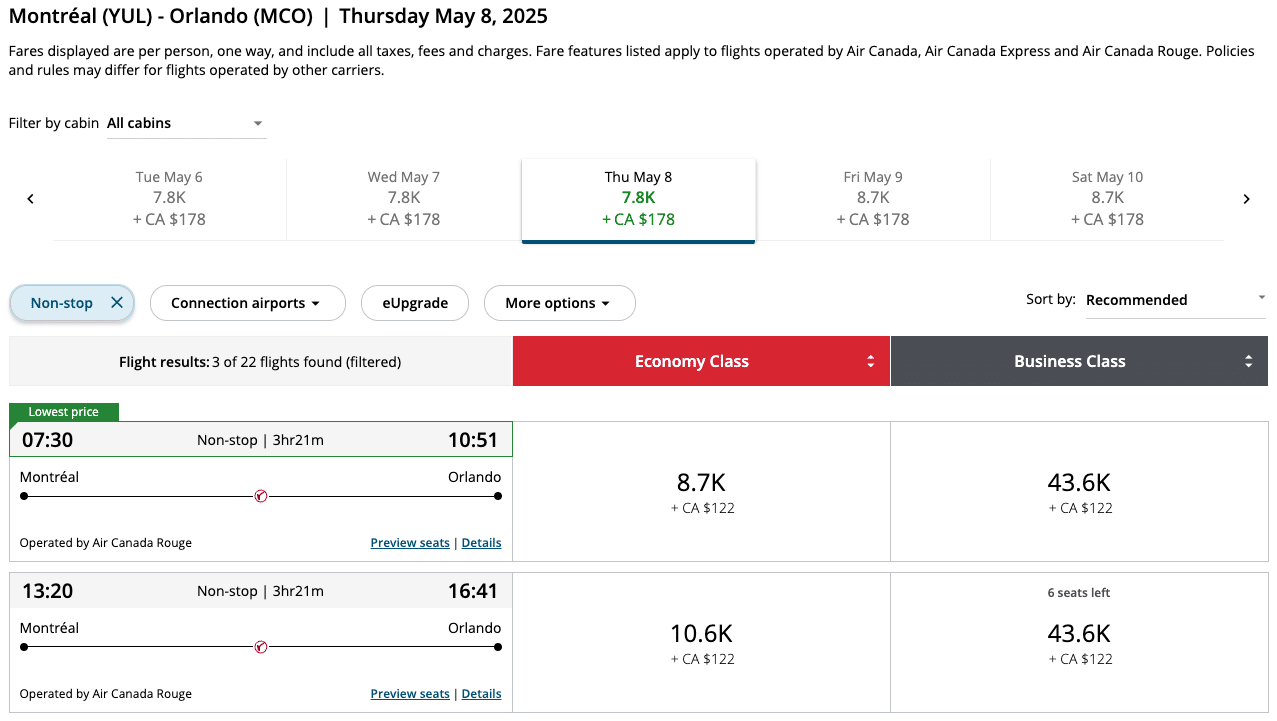 With multiple daily flights between Montreal (YUL) and New York City (NYC), you won’t find it too difficult to snag an award seat at the lower end of the dynamic price range.