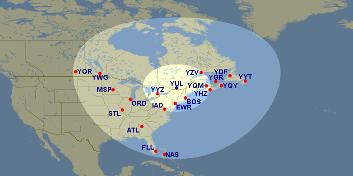In the second distance band, flights from Montreal open up access to Atlantic Canada and a variety of US cities like Orlando, Fort Lauderdale, and Chicago.