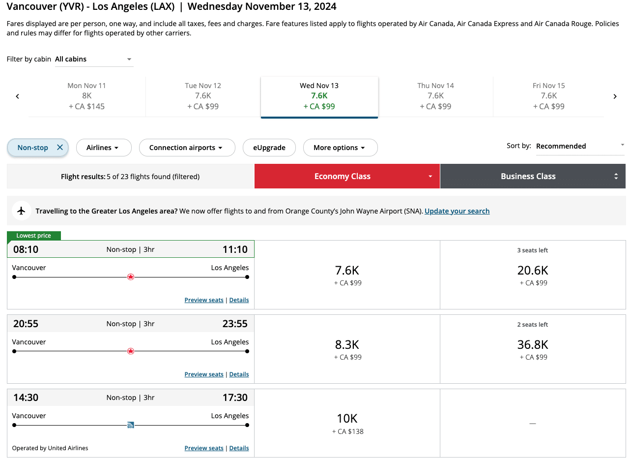 One of our favourite redemptions out of Vancouver (YVR) is for flights to Los Angeles (LAX), with one-way economy awards showing for around 7,600 Aeroplan points, plus $99 in taxes and fees.