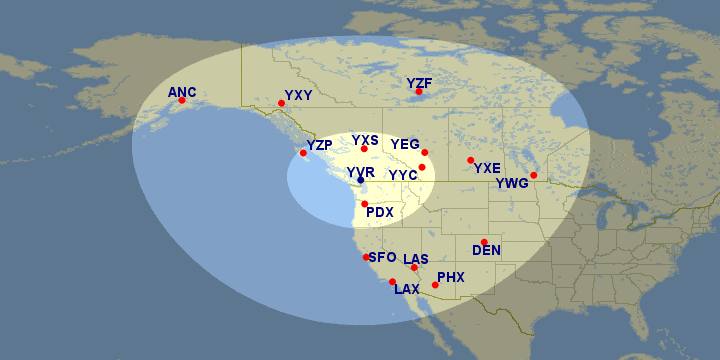 The second distance band opens up access to a wider range of cities, including Saskatoon, Winnipeg, Yellowknife, Whitehorse, and US cities like Los Angeles, San Francisco, Palm Springs, Phoenix, and Anchorage.