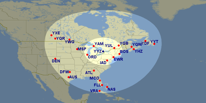 In the first distance band, you can reach cities like Deer Lake, Sydney, and Boston, while the second distance band opens up access to Toronto, St John’s, and Orlando.