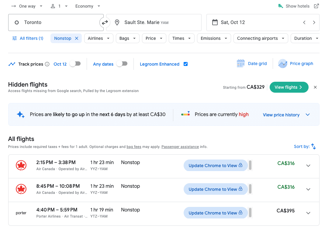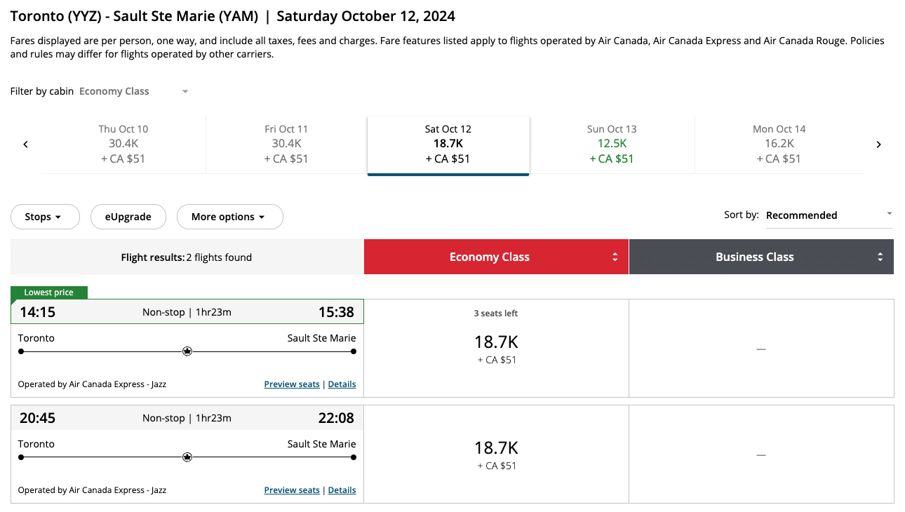 While award flight prices from Toronto to Sault Ste. Marie often exceed the higher end of Aeroplan’s dynamic points range for this distance band, the cash prices for this flight generally hover around $300–400 (all figures in CAD), making this a great redemption opportunity despite the higher points price.
