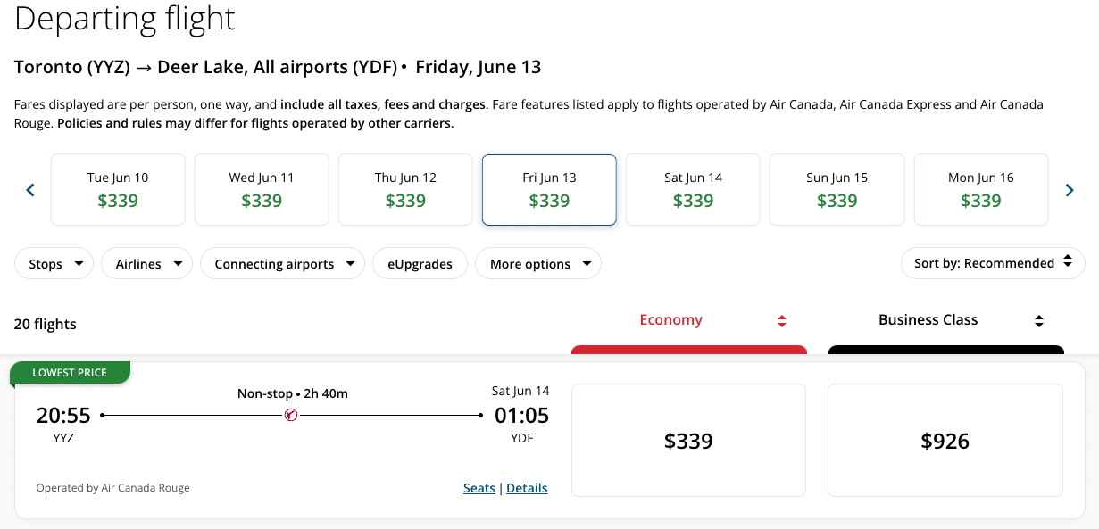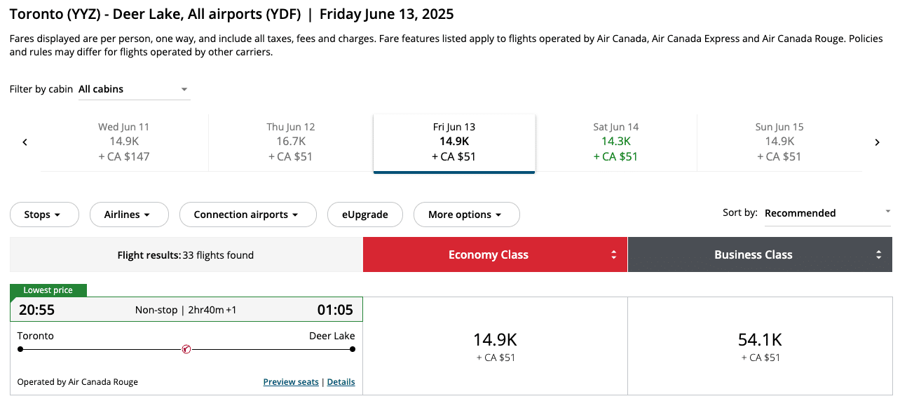 A flight from Toronto (YYZ) to Deer Lake (YDF) typically hovers around 14,900 Aeroplan points, while the cash price is usually around $339. This means that this redemption has a value of about 1.93 cents per point, which is pretty solid.