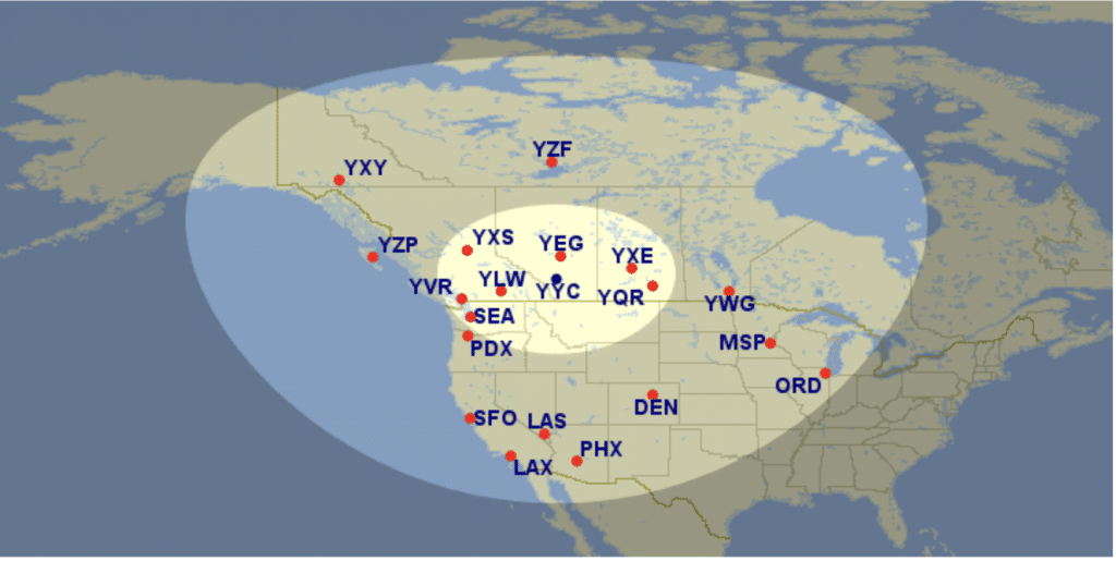 The second distance band opens up access to a wider range of cities, including Saskatoon, Winnipeg, Yellowknife, Whitehorse, and US cities like Los Angeles, San Francisco, Palm Springs, Phoenix, and Anchorage.
