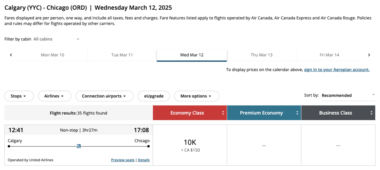Aeroplan’s partner airline United Airlines operates a non-stop route from Calgary (YYC) to Chicago (ORD), with economy class priced at a fixed rate of 10,000 Aeroplan points. While the taxes and fees can be high on this route, this redemption may be worthwhile during peak seasons when flight prices typically surge.