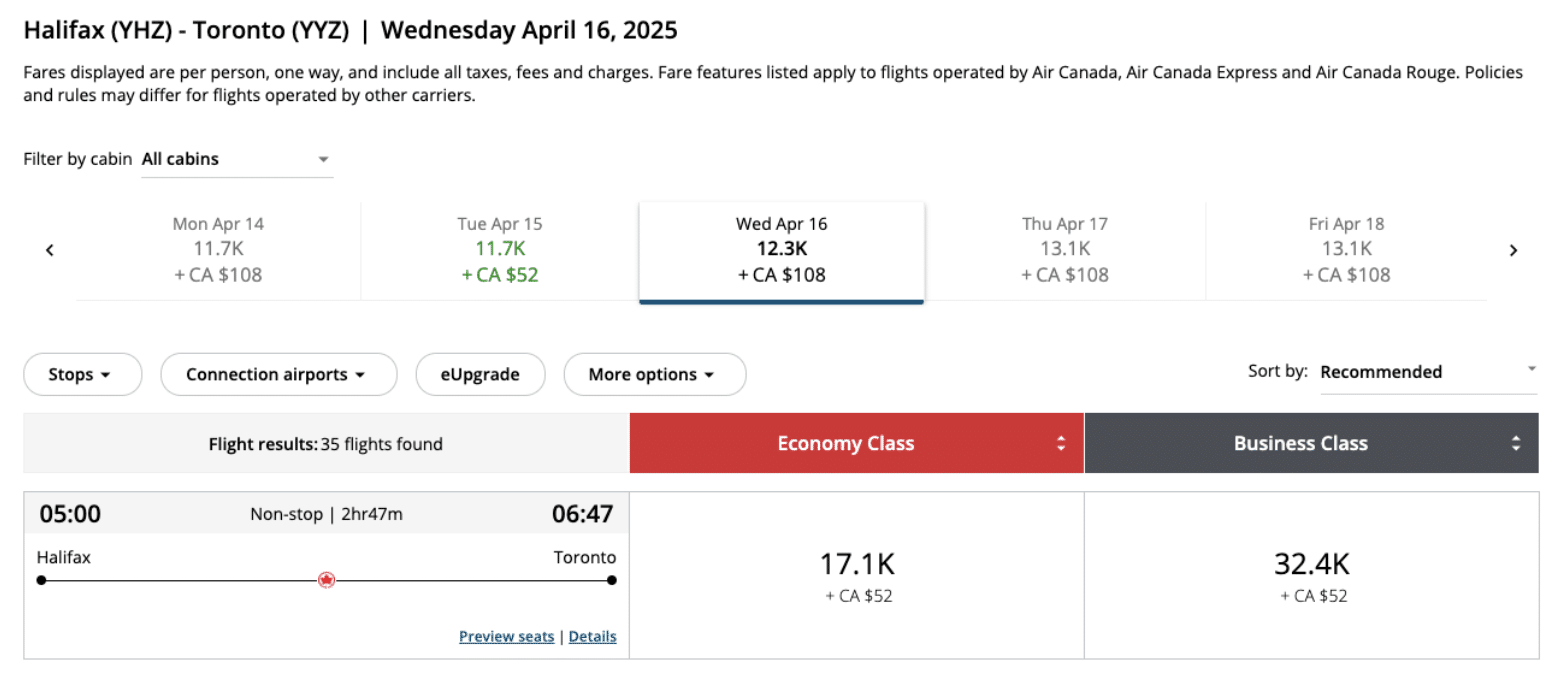 When looking for decent redemption value, we’ll aim to find flights that are priced towards the lower end of the dynamic range for flights with Air Canada and the fixed cost price in points for redemptions with partner airlines.