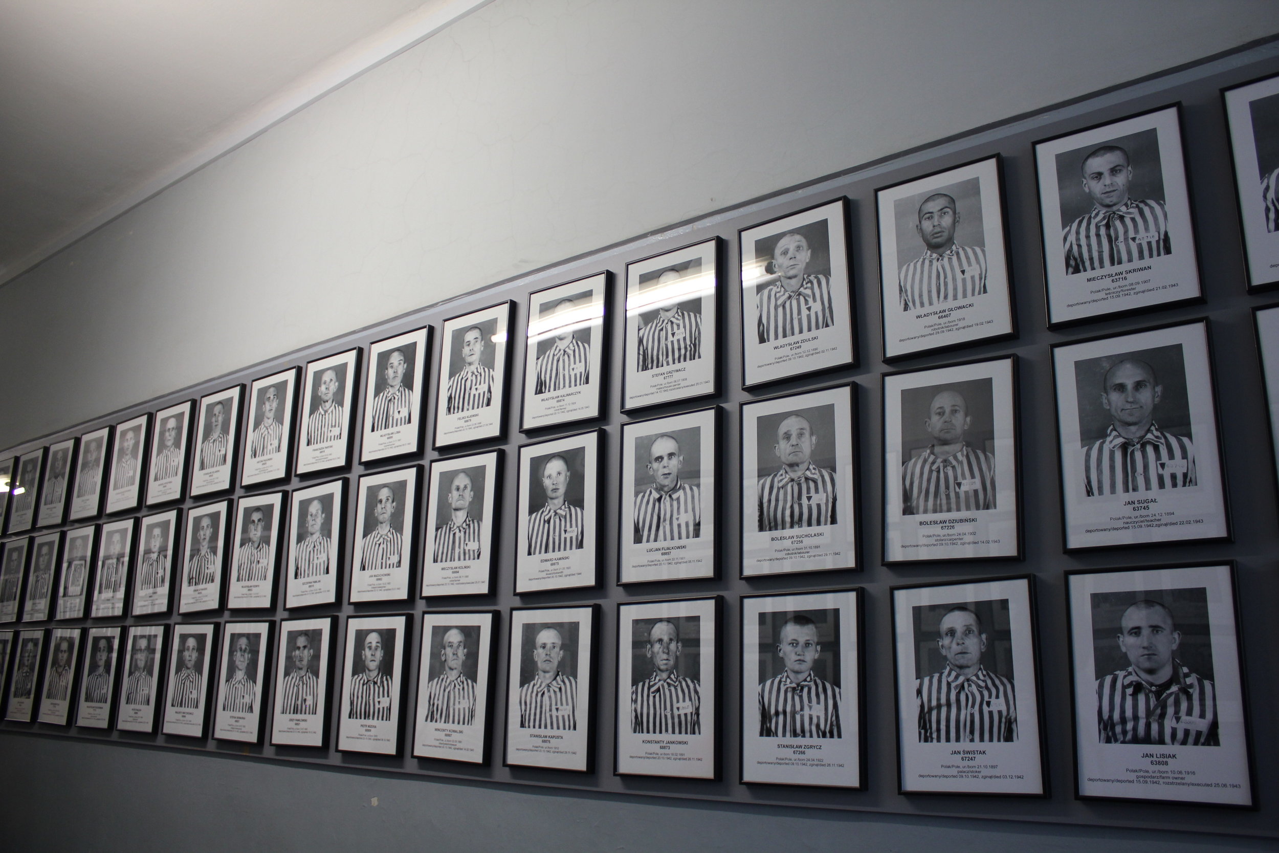 Photos of Holocaust victims, taken from the Nazi files, are hung up along this wall to honour their memory
