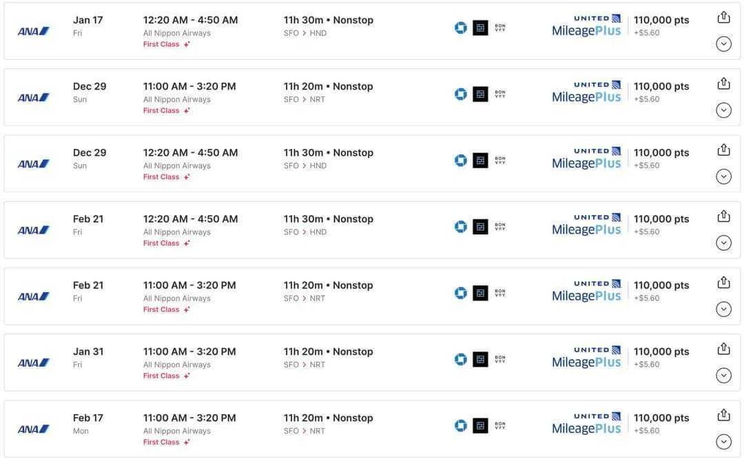 ANA First Class is currently offered between Tokyo (NRT/HND) and New York (JFK), San Francisco (SFO), and Chicago (ORD). The product is also available on flights to Honolulu (HNL) for fewer points than to the continental US.