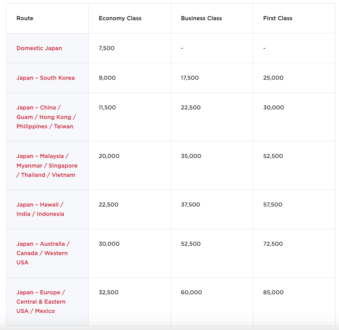 With Virgin Atlantic Flying Club, you can book one-way ANA flights per the following chart: