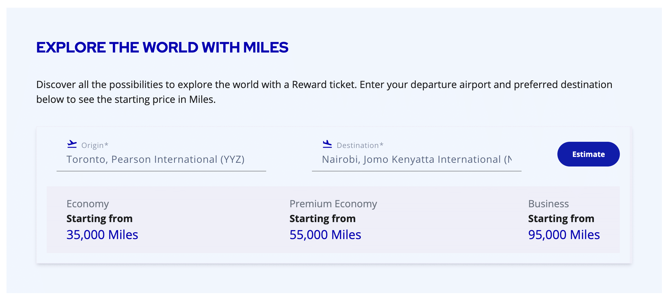 Next, I figured out what the saver prices should be for each of my segments. Using the Flying Blue miles calculator, I gleaned that Toronto to Paris should cost 50,000 miles and Paris to Nairobi (and therefore, anywhere in Europe to Nairobi) should cost 70,000 miles.