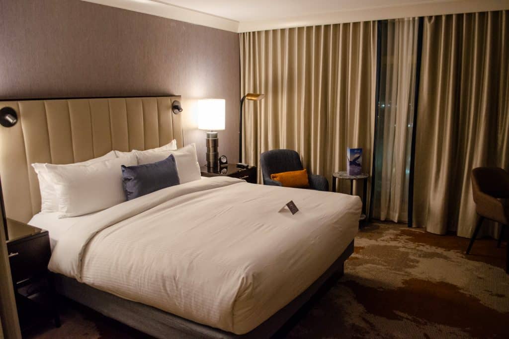 Rooms are soundproofed and feature floor-to-ceiling windows that frame stunning views of the runways and North Shore Mountains. Inside, you’ll find plush bedding, spacious bathrooms with soaker tubs and separate showers, and elegant décor that feels far removed from the typical airport hotel experience.