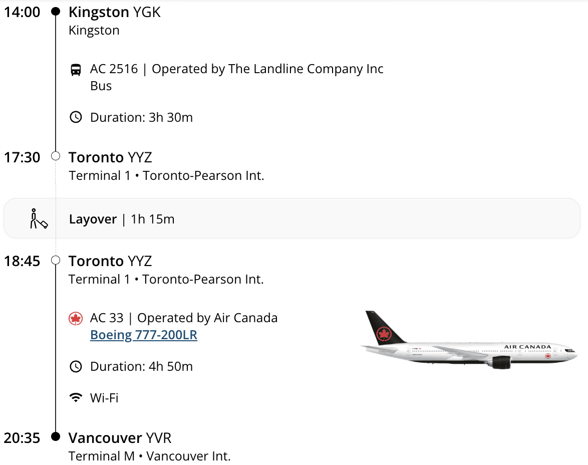 In the search results, you’ll notice a bus logo the shows the motorcoach service, and then an Air Canada logo for your connecting flight.