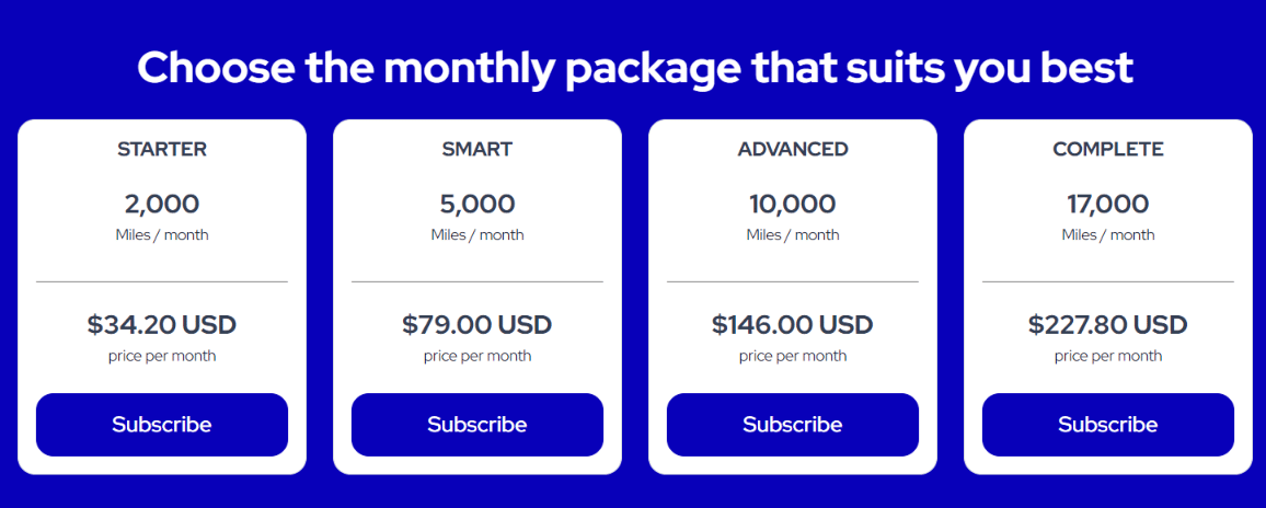 Here’s a look at the four monthly subscription options members can choose from, including how much each costs (all figures in USD) and the amount of miles you’ll get: