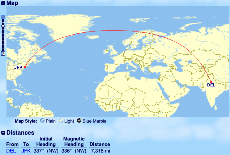 According to Great Circle Mapper, a one-way flight between Delhi and New York (JFK) measures 7,318 miles.