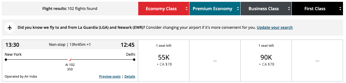 In economy, you can expect to pay 55,500 Aeroplan points, or 90,000 points in business class for a flight between Delhi and New York (JFK). Indeed, these prices are what we find on the Aeroplan website.