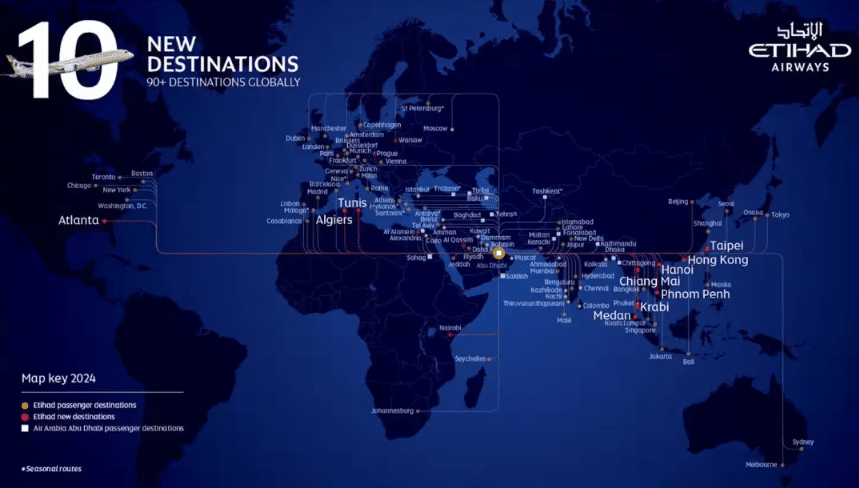 The ten routes, all announced in one day, will complement Etihad’s previously revealed destinations of Prague, Warsaw, and Al Alamein, which will commence in 2025.