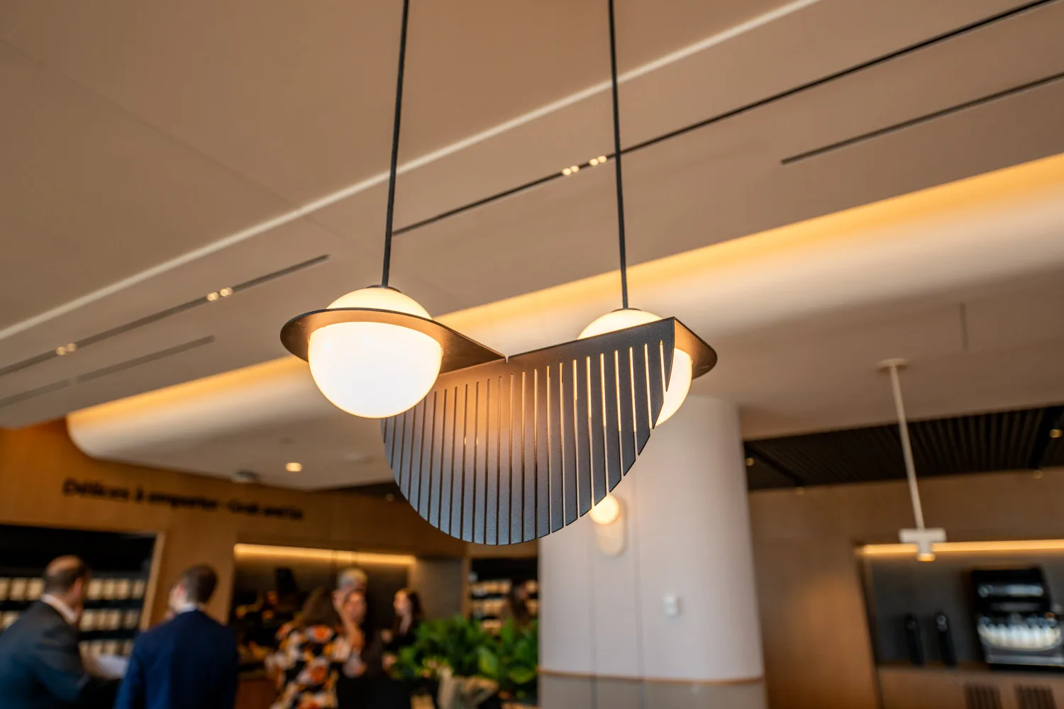After walking past the Bonjour/Hello penny tiles in the lounge’s foyer, you’ll notice ceilings that represent an aircraft fuselage, and windows that were inspired by the mid-century modern Montreal metro system.