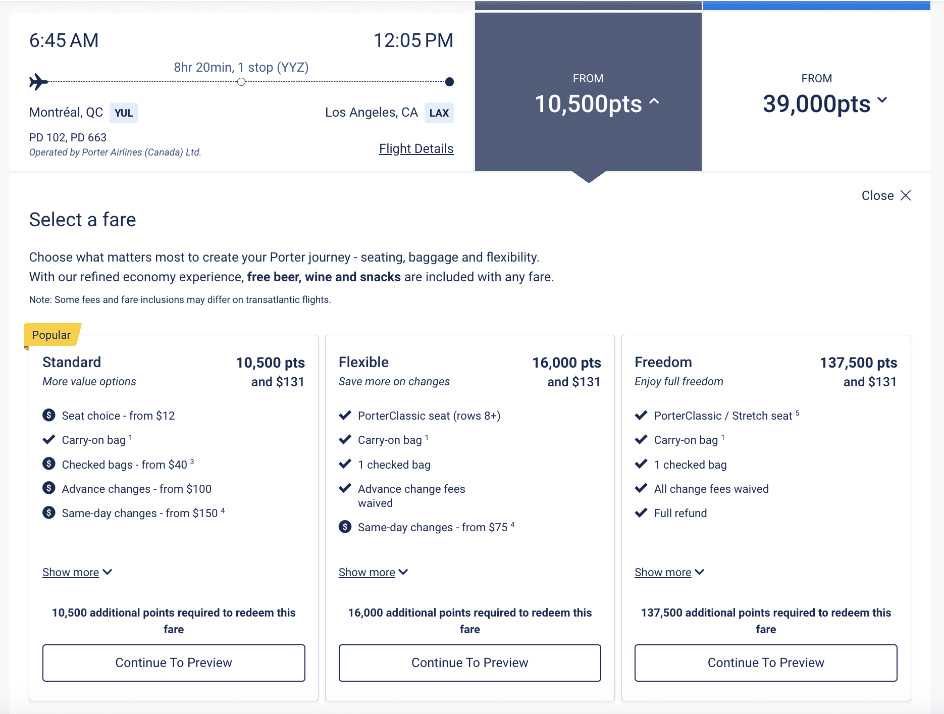 Montreal (YUL) – Toronto (YYZ) – Los Angeles (LAX): 10,500 points