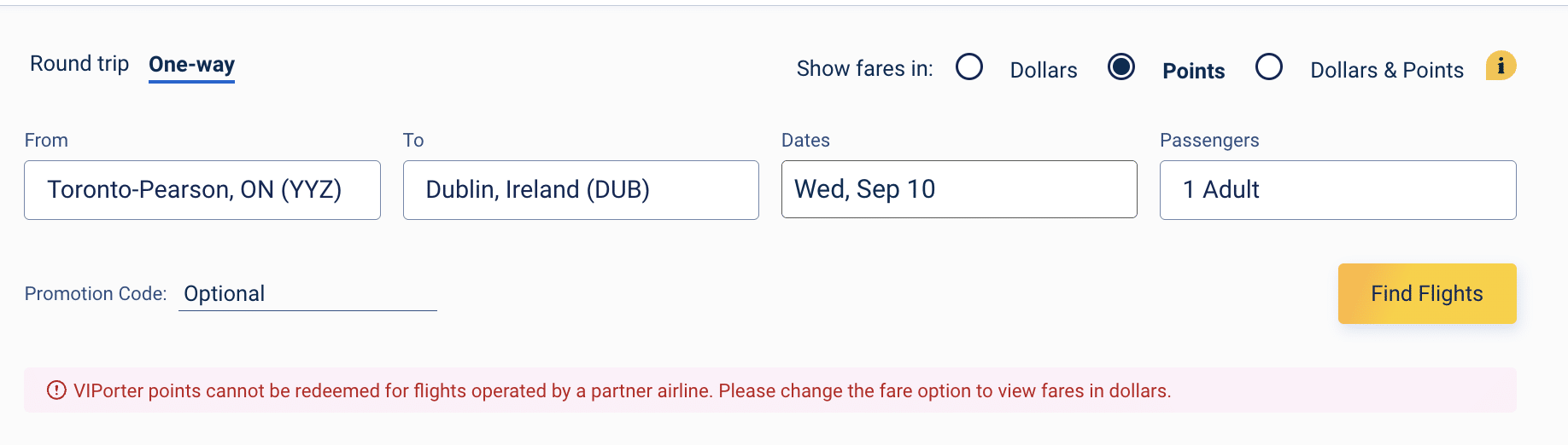 A search for award flights on flyporter.com provides a glimpse into how VIPorter points can be used on partner airlines.