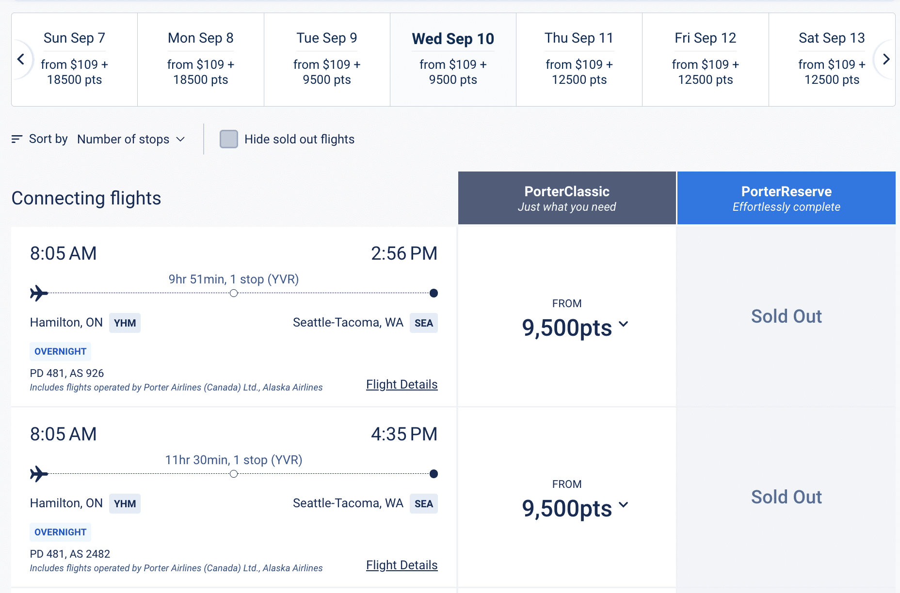 Hamilton (YHM) – Vancouver (YVR) – Seattle (SEA): 9,500 points