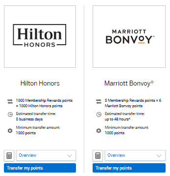 In this case, MR points can be transferred to Marriott Bonvoy at a rate of 5:6, and to Hilton Honors at a rate of 1:1, following the same rules for transfer quantities as above.
