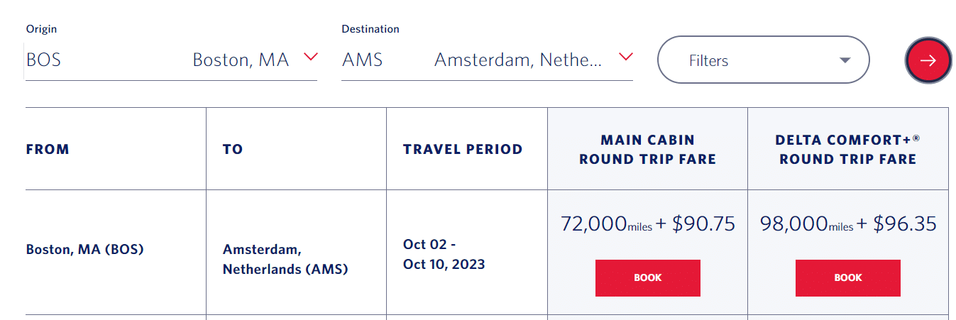 For 98,000 SkyMiles, you can redeem a round-trip ticket from Boston to Amsterdam in premium economy or Delta Comfort+. The same redemption may cost 192,000 SkyMiles if not redeemed through SkyMiles Deals.
