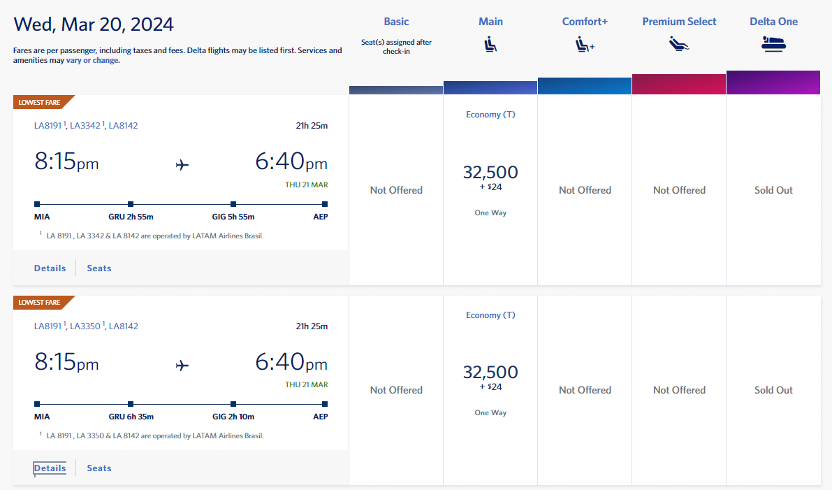 For example, you can fly from Miami to Buenos Aires in economy with LATAM Airlines for as low as 32,500 SkyMiles. When flown non-stop, the route covers 4,400 miles and takes 9 hours, so it’s good value.