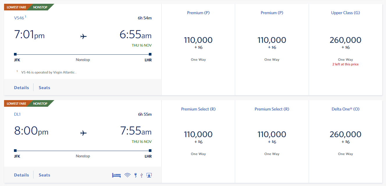 Like Delta-operated flights, there’s no published award chart for redeeming SkyMiles with partner airlines, so you’re also at the mercy of dynamic pricing. For example, a one-way business class award from New York to London may cost 260,000 SkyMiles for both a Delta-operated flight and a Virgin Atlantic-operated flight.