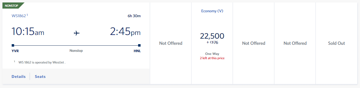For example, a one-way economy flight on the popular Toronto-Vancouver route only costs 12,500 SkyMiles. You could also fly direct from Vancouver to Honolulu with WestJet for only 22,500 SkyMiles.