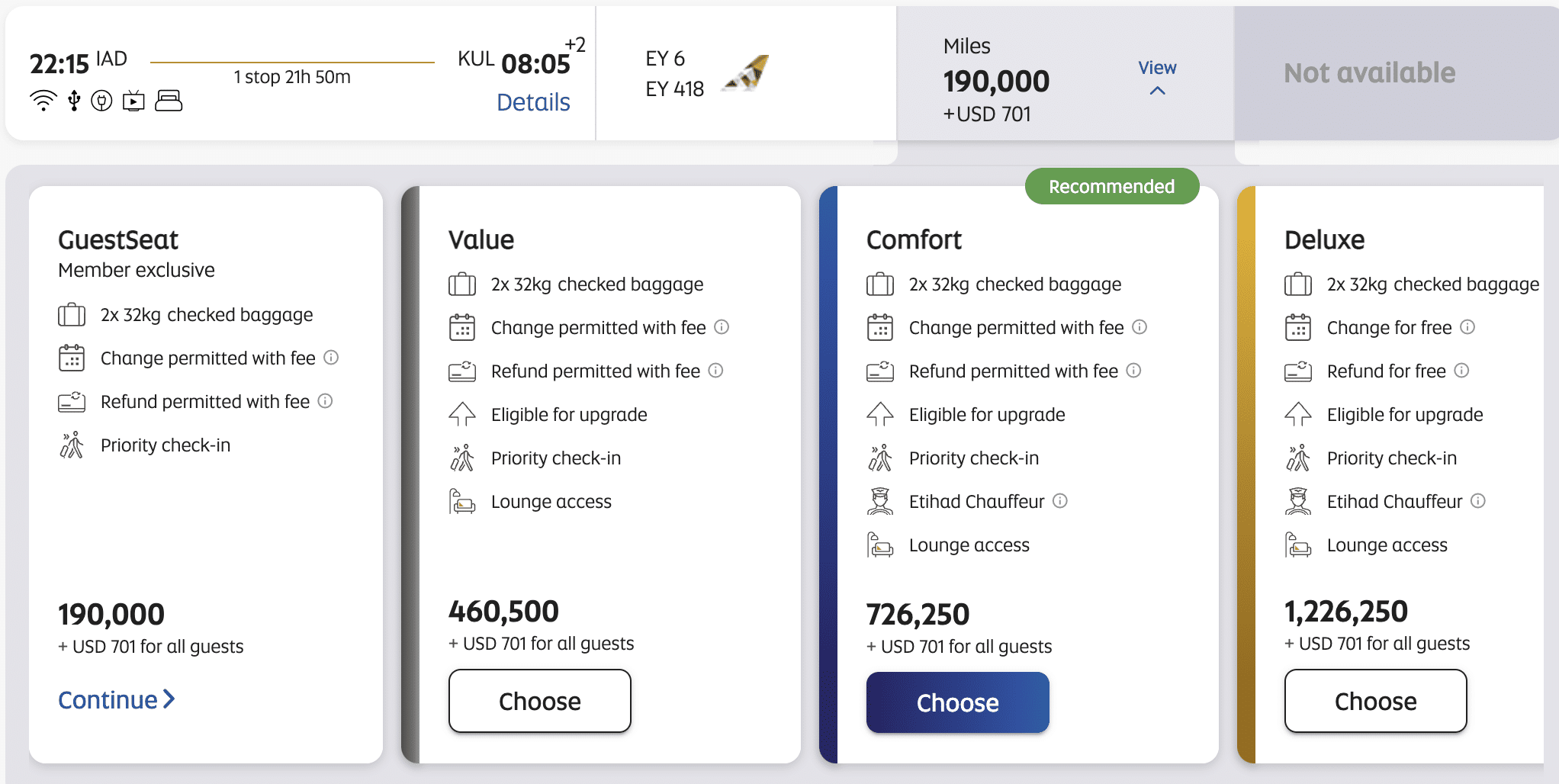 As an example, let’s take Washington DC to Kuala Lumpur via Abu Dhabi in business class. Washington DC to Abu Dhabi, which covers a distance of 7,088 miles, costs 120,000 miles. On the other hand, Abu Dhabi to Kuala Lumpur, which covers a distance of 3,473 miles, costs 70,000 miles.