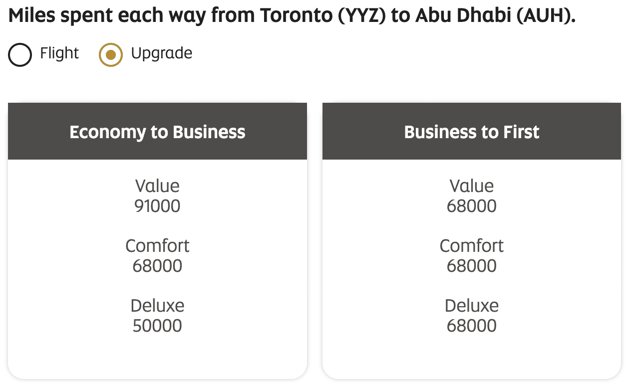 For instance, a one-way upgrade from Toronto to Abu Dhabi costs the following miles: