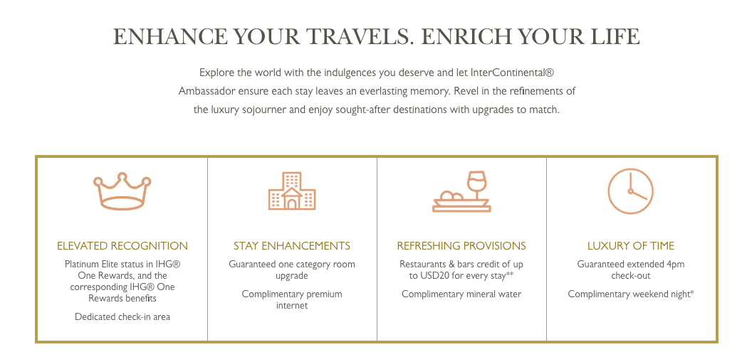 If you frequent InterContinental Hotels & Resorts, IHG One Rewards has a subprogram called InterContinental Ambassador that you might find beneficial. Foremost, the program provides an automatic upgrade to Platinum Elite status and its associated benefits.