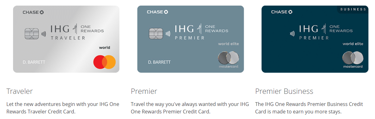 Chase is the sole issuer of IHG co-branded credit cards in the US, and the bank offers three cards you can choose from: IHG Rewards Traveler Credit Card, IHG Rewards Premier Credit Card, and IHG Rewards Premier Business Credit Card.