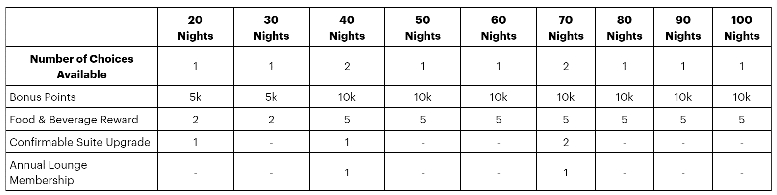 Milestone Rewards are earned starting at 20 nights through 100 nights. You’ll choose one reward for every 10 nights, and you’ll get an extra reward on your 40th and 70th nights.