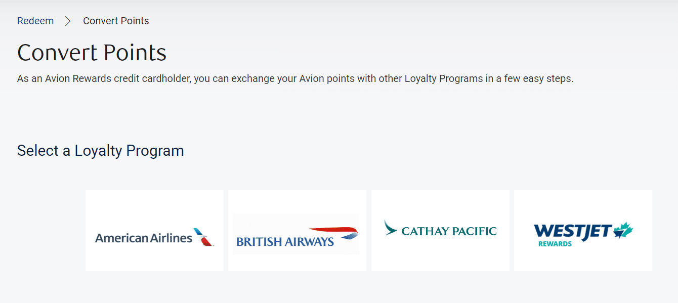 Avion points earned under an account in the Avion Elite tier can be transferred to four airline loyalty programs (The British Airways Club at a 1:1 ratio, Cathay Pacific Asia Miles at a 1:1 ratio, American Airlines AAdvantage at a 1:0.7 ratio, and WestJet Rewards at a 1:1 ratio), redeemed through RBC’s Air Travel Redemption Schedule for outsized value, or used for gift cards and statement credits for lesser value.