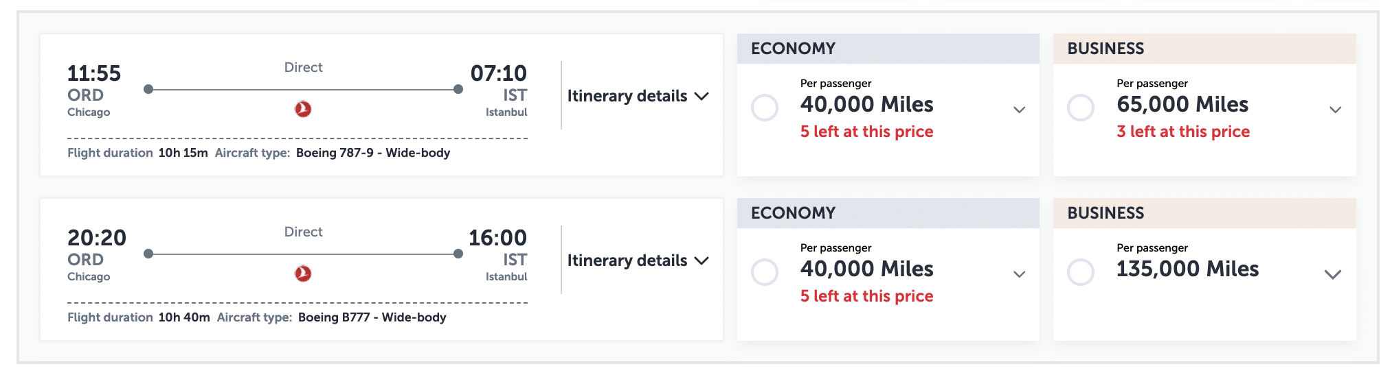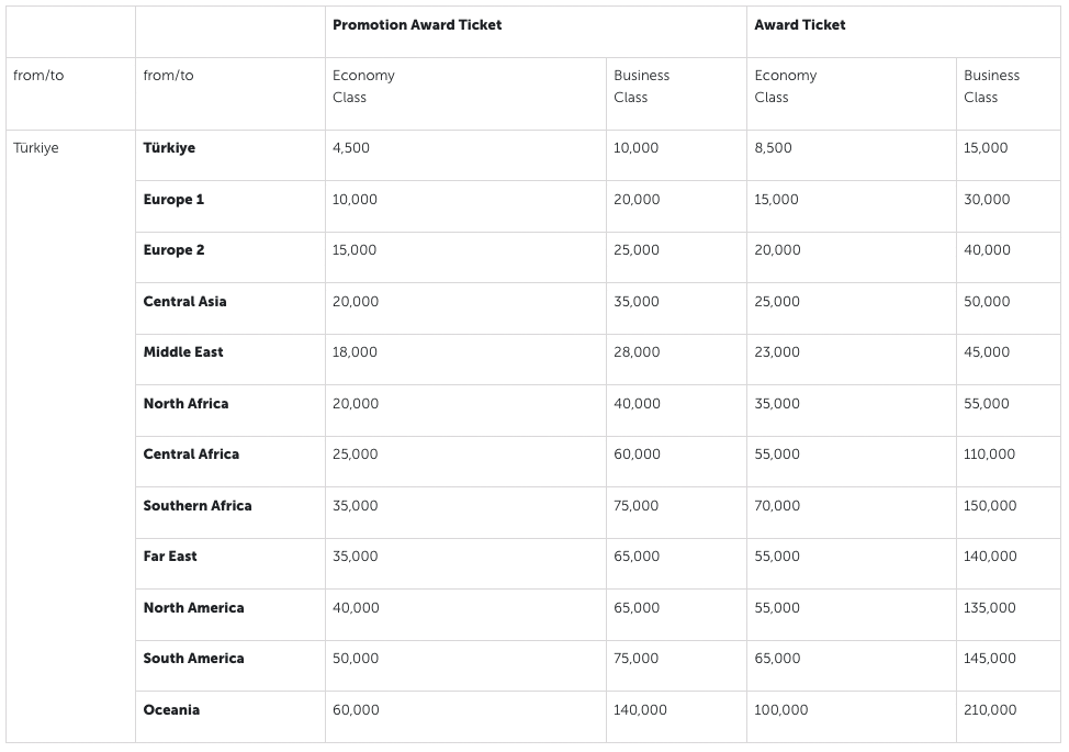 Thus, from any city in the US or Canada, a one-way business class ticket to Türkiye costs 65,000 miles as a promotion award, and 135,000 miles as a regular award.