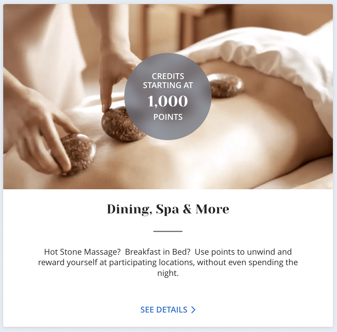 Specific participating Hyatt hotels and resorts allow you to use your World of Hyatt points towards specific on property experiences such as dining and spa treatments.