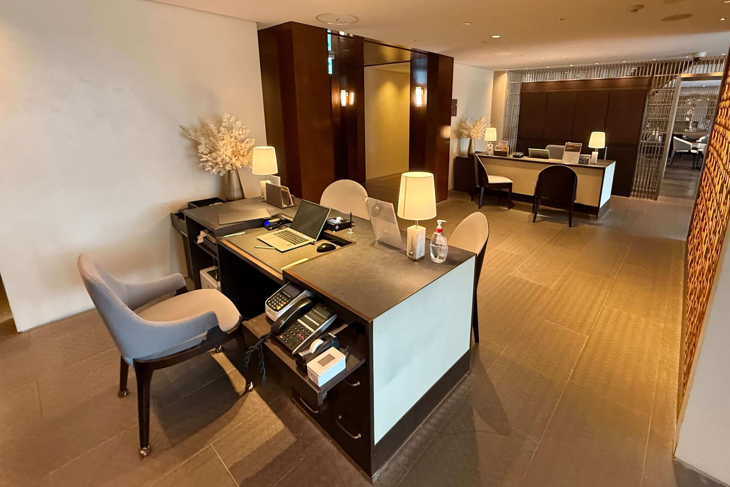 During busy periods, Bonvoy members with Platinum status or higher are invited to the Executive Lounge on the 9th floor to complete check-in procedures, allowing guests to be seated at dedicated desks for a more personalized and relaxed experience.
