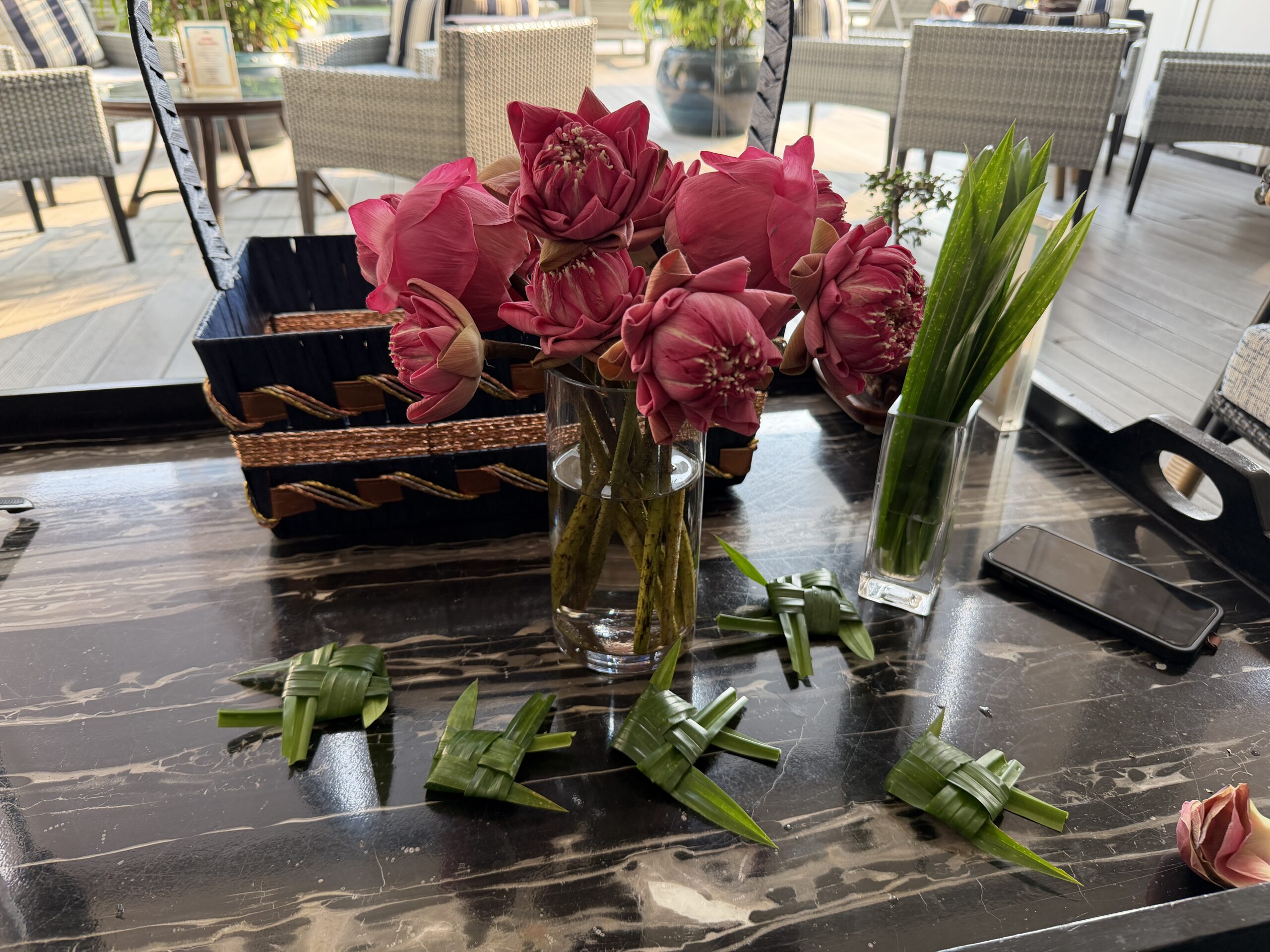 During my stay, I joined Floral Journeys, an afternoon workshop hosted at The View bar overlooking the pool. Over the course of an hour, one of the hotel’s team members patiently walked us through the art of folding lotus flowers and weaving pandan leaves into small decorative pieces.