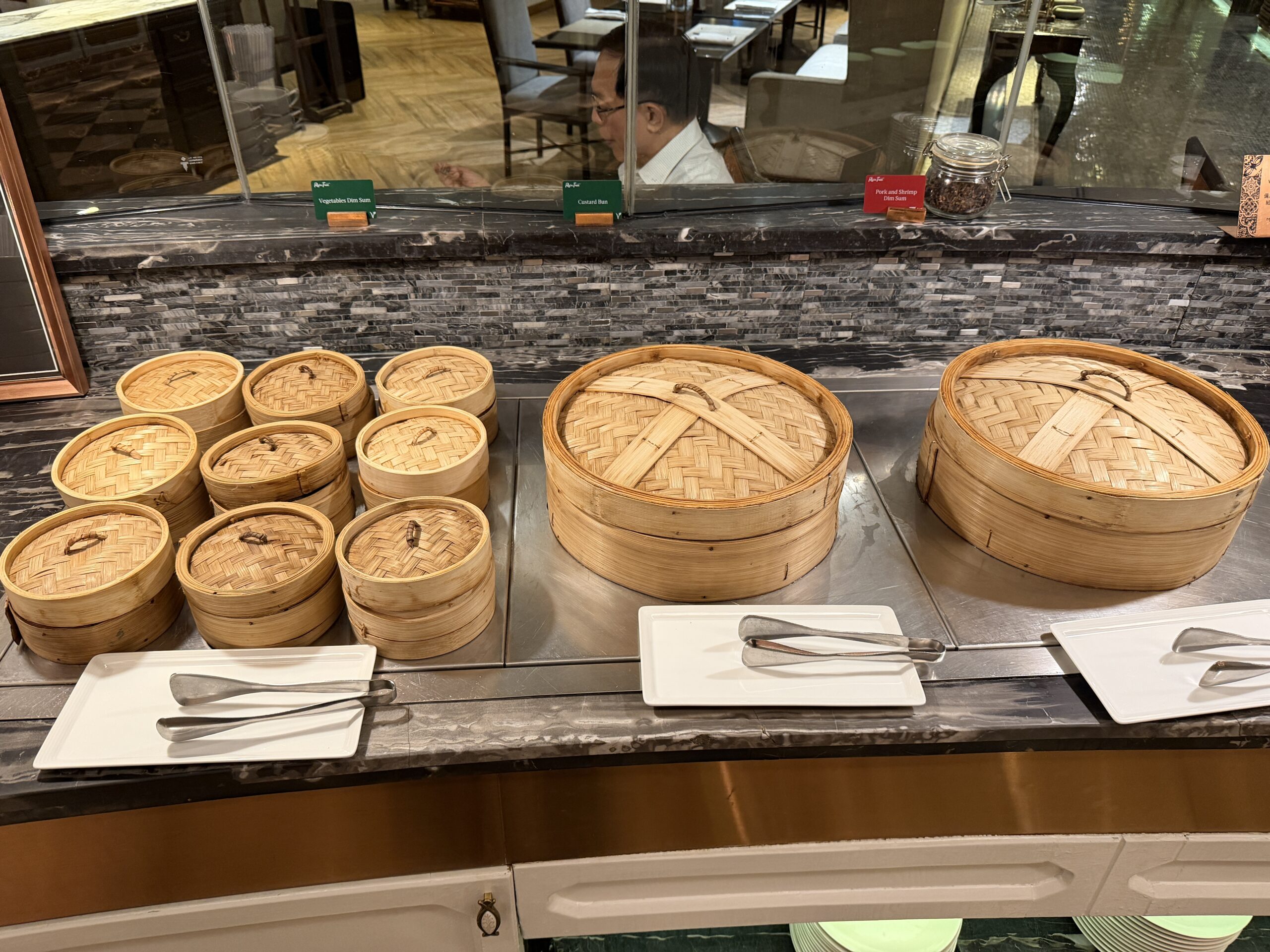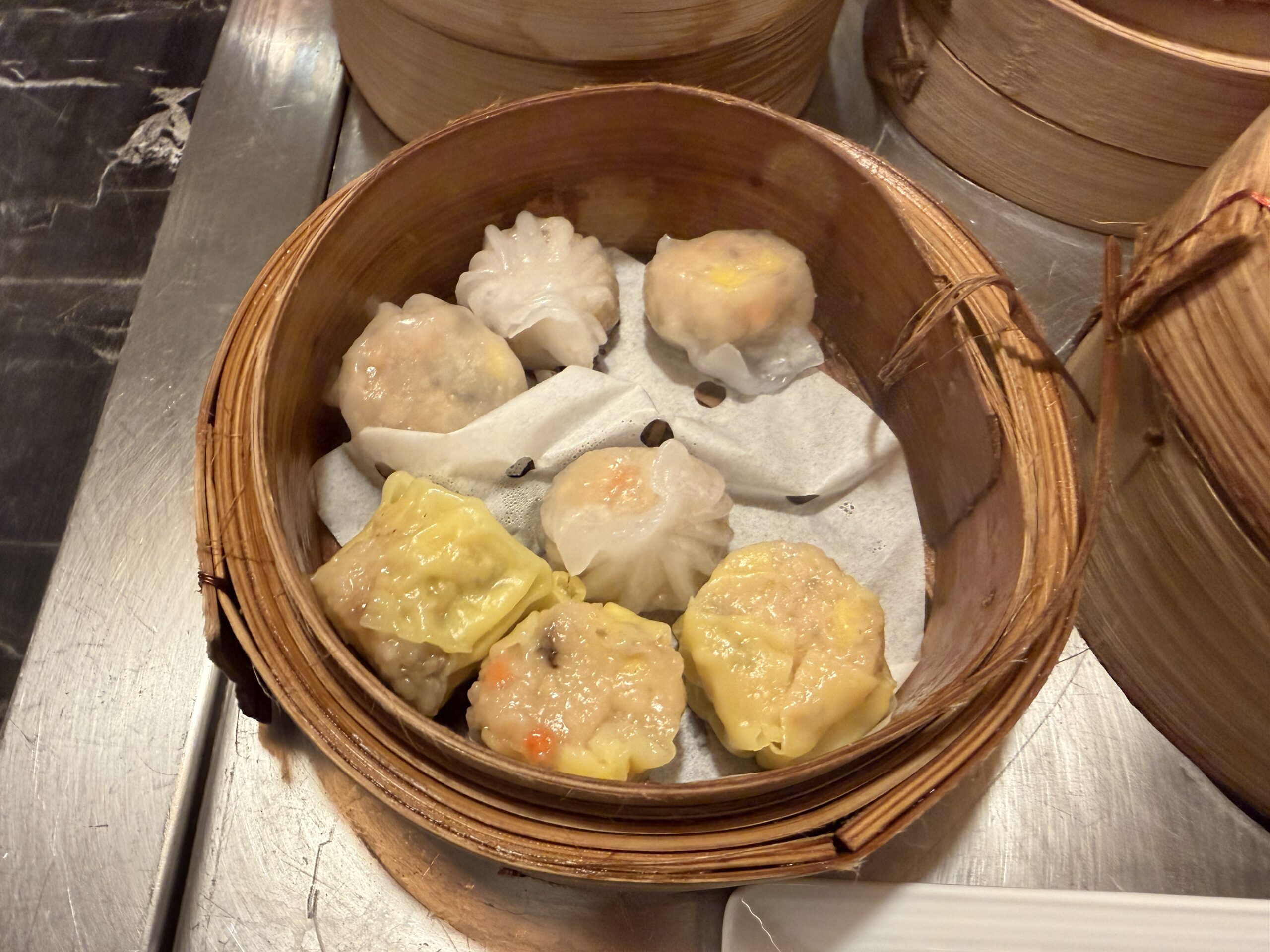 On the Chinese station, there was a full dim sum selection with baskets of siu mai, har gow, and steamed buns, plus Chinese dough fritters with sesame oil, soy sauce, or condensed milk.