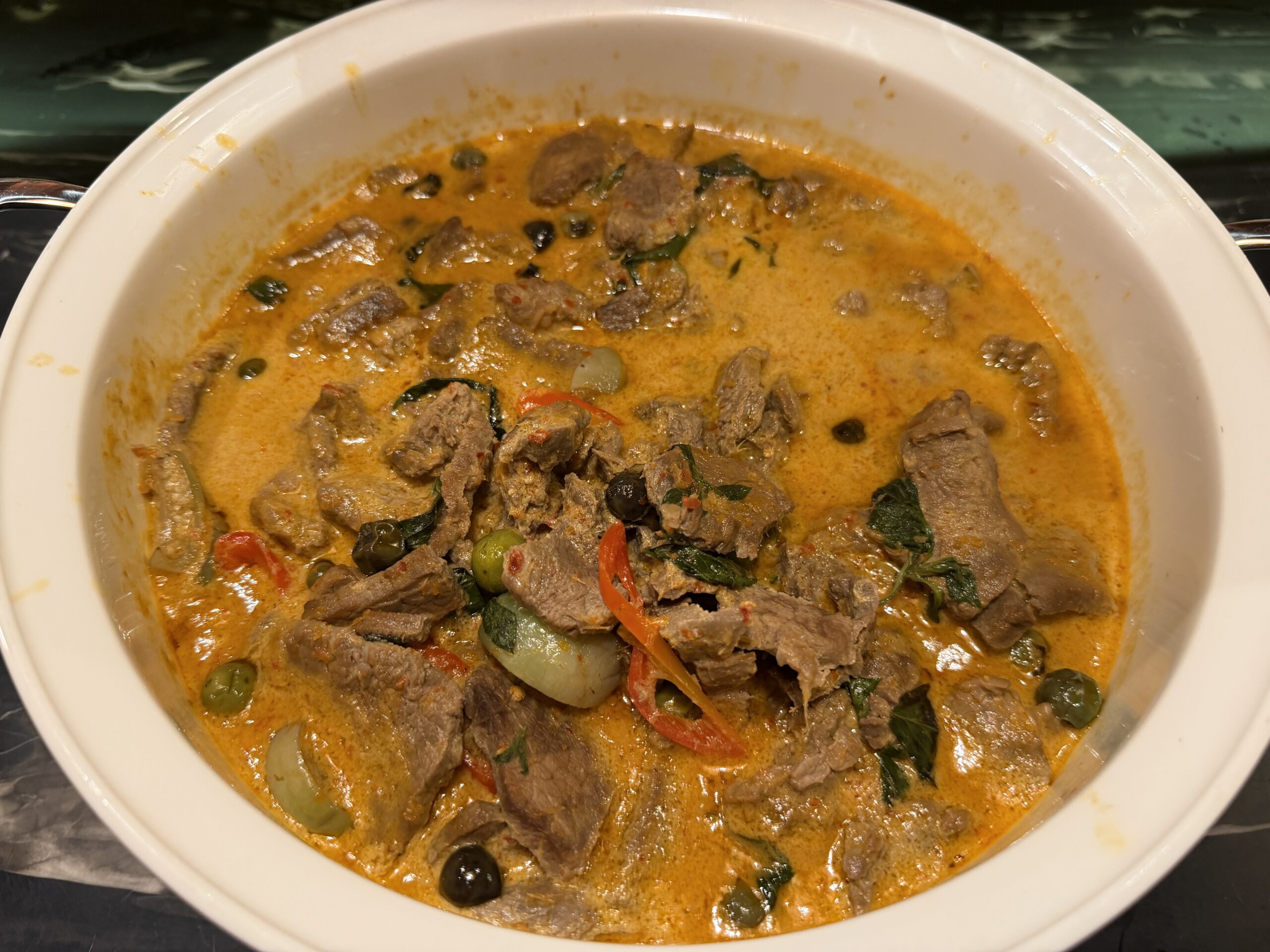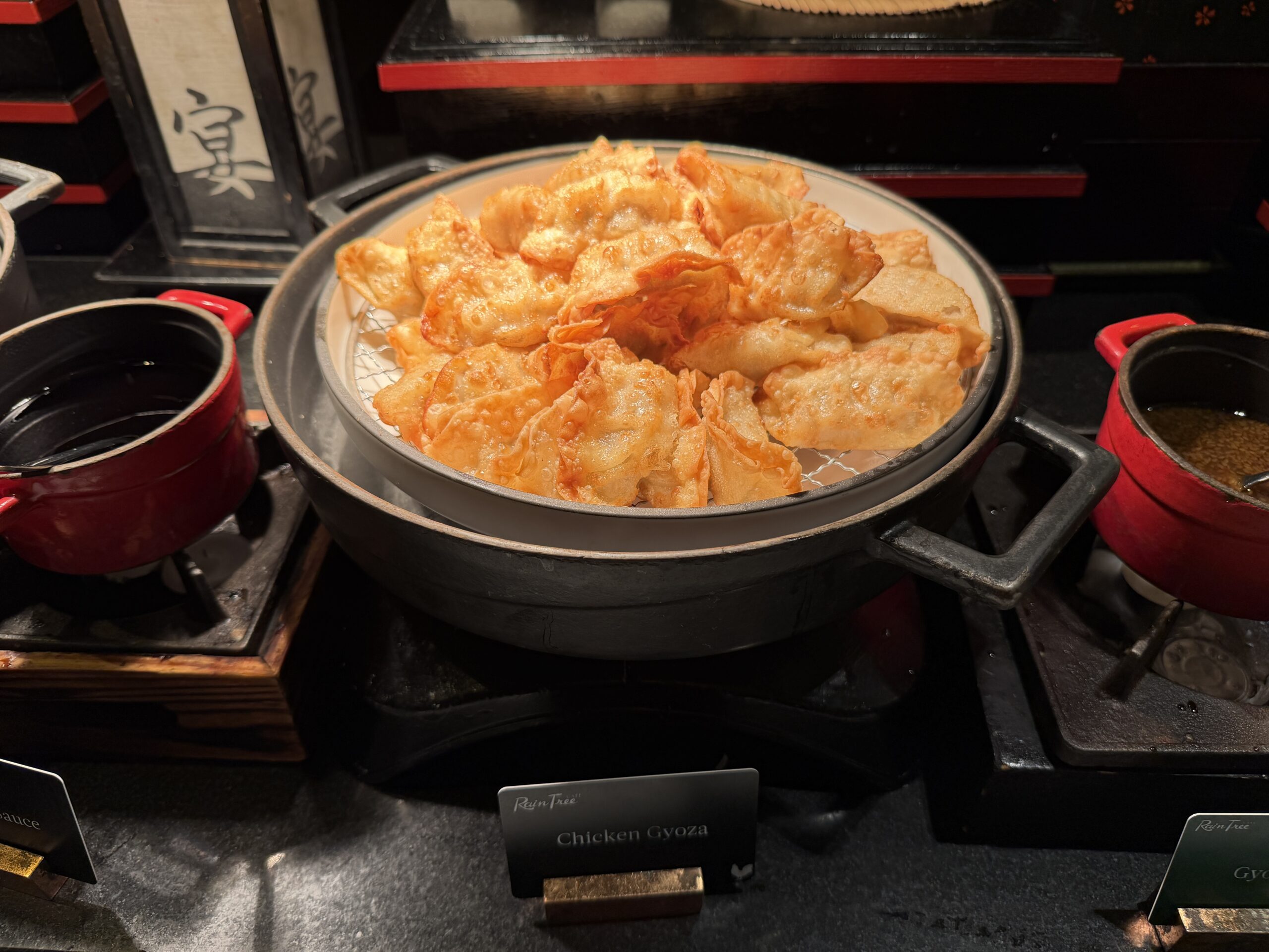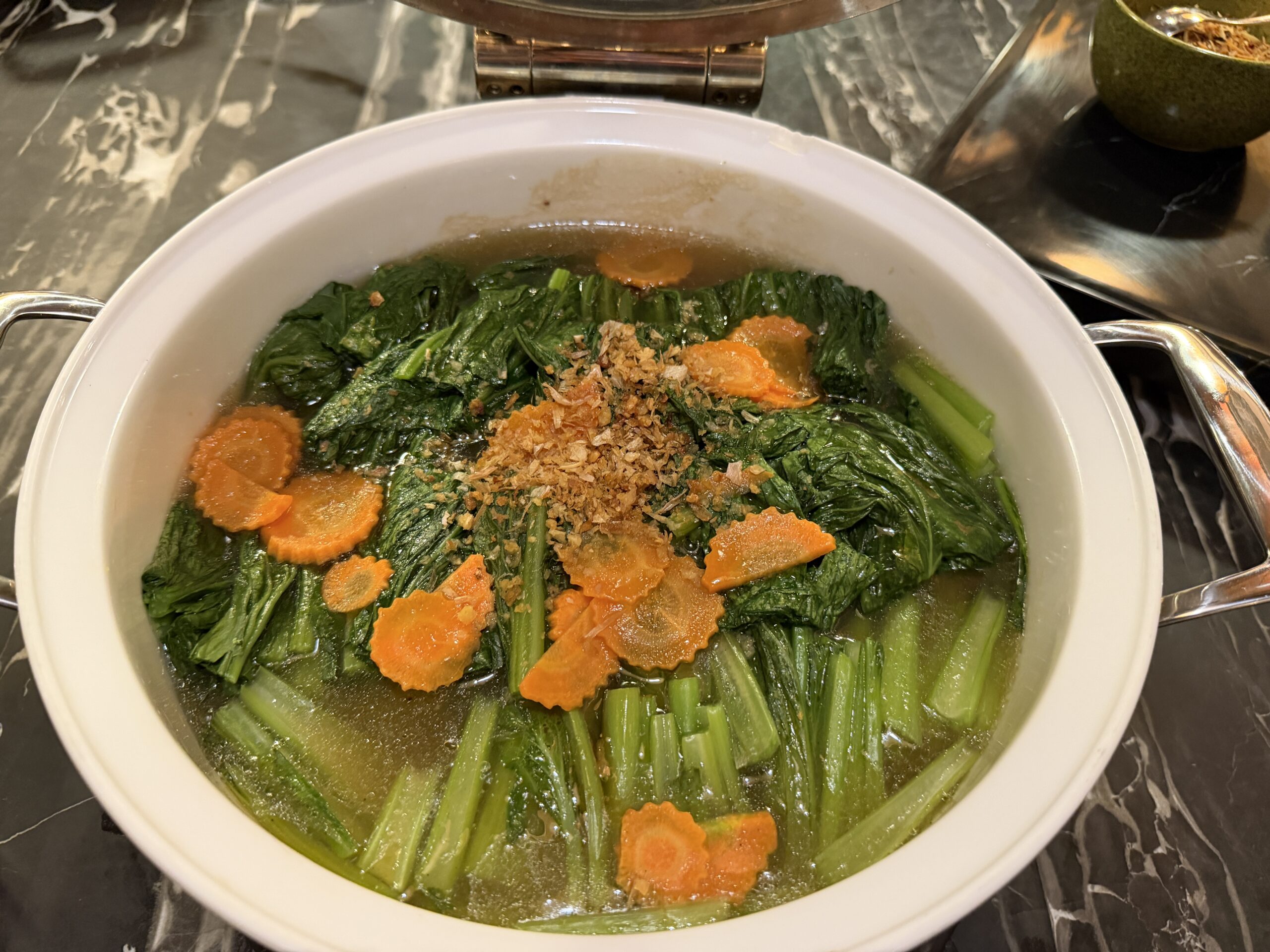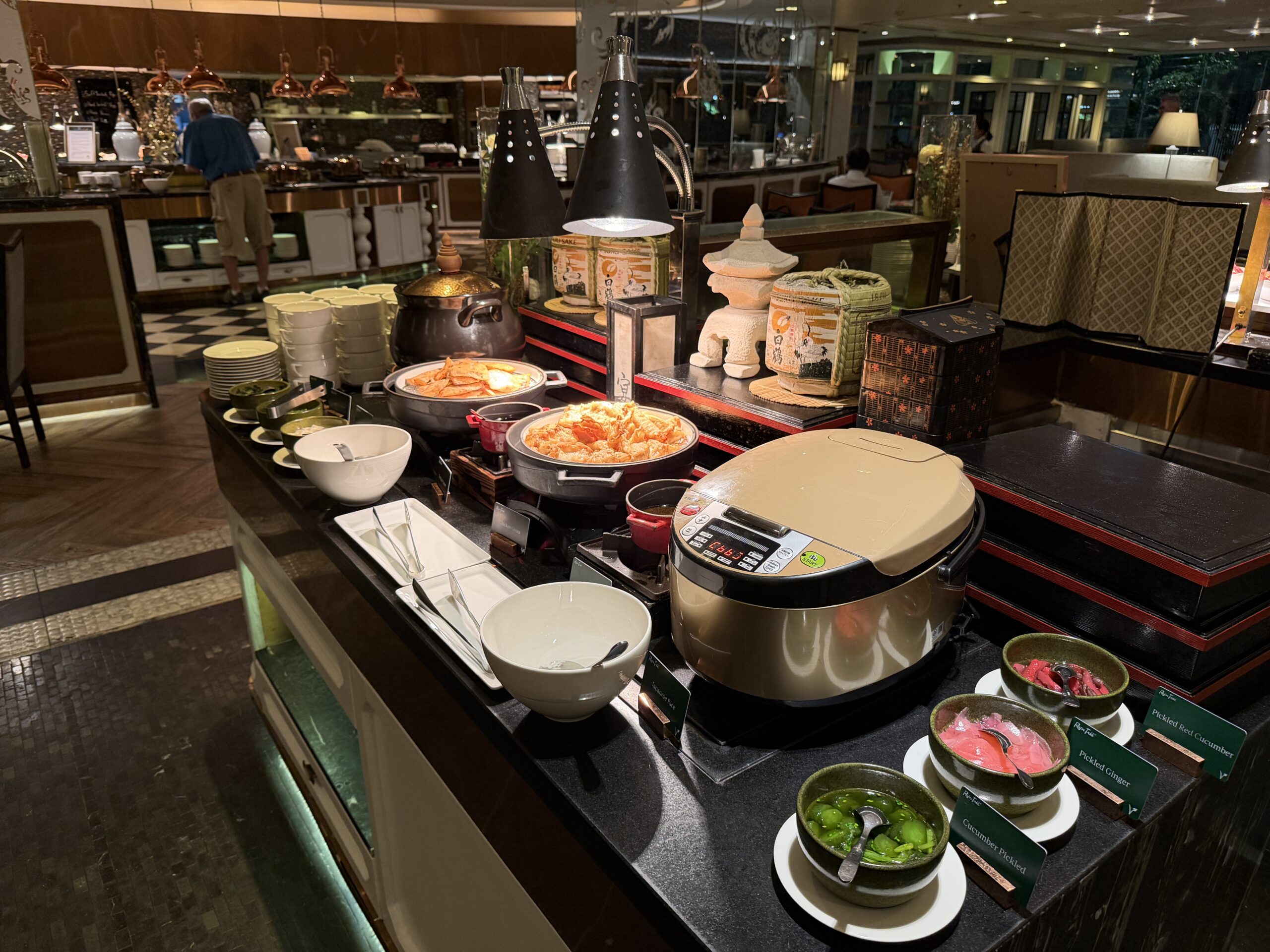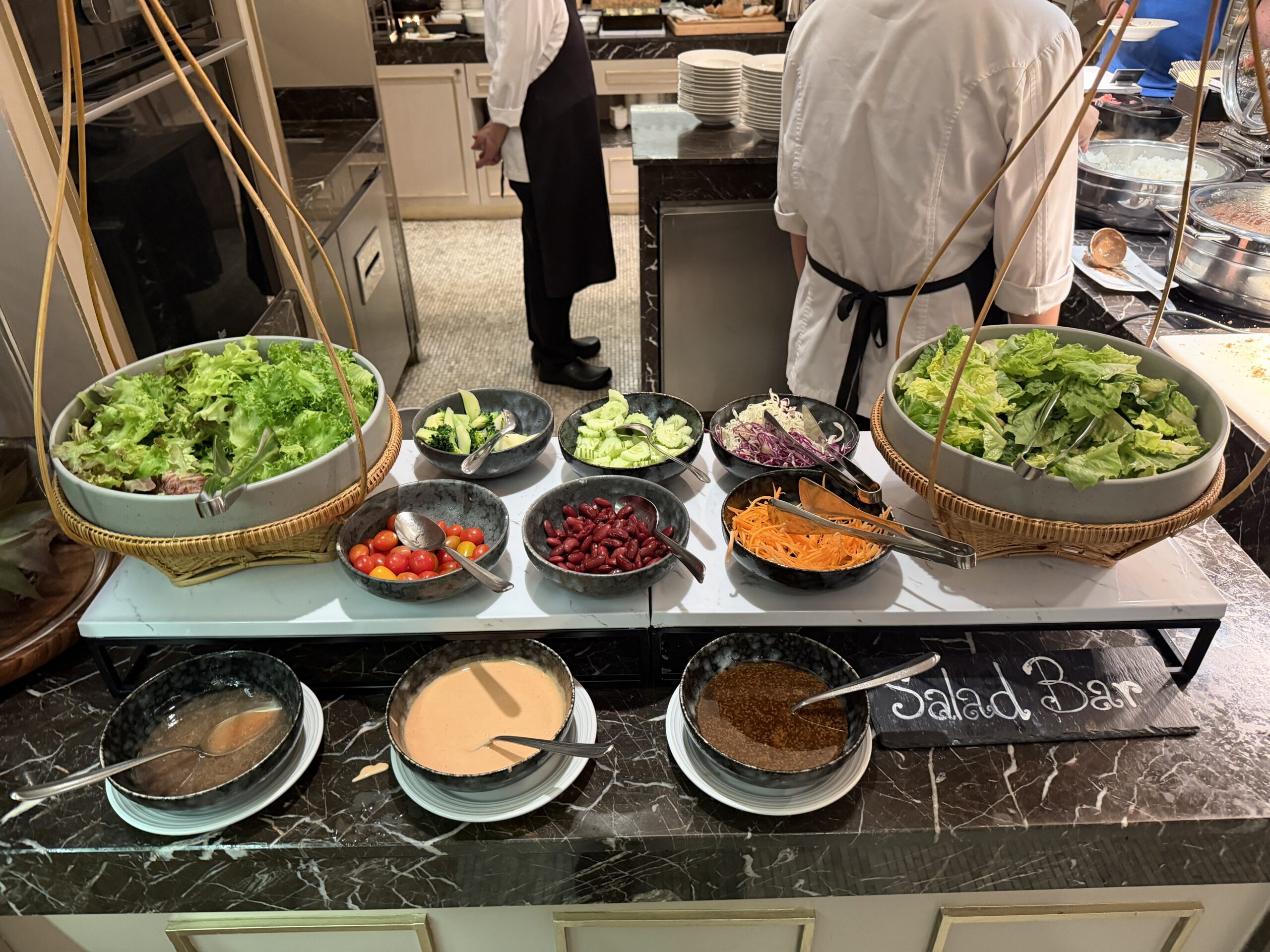 At the noodle station, a chef prepares bowls of laksa to order. You choose your noodles, vegetables, and toppings, and everything gets assembled in a fragrant, mildly spicy broth – a great alternative to the buffet trays.