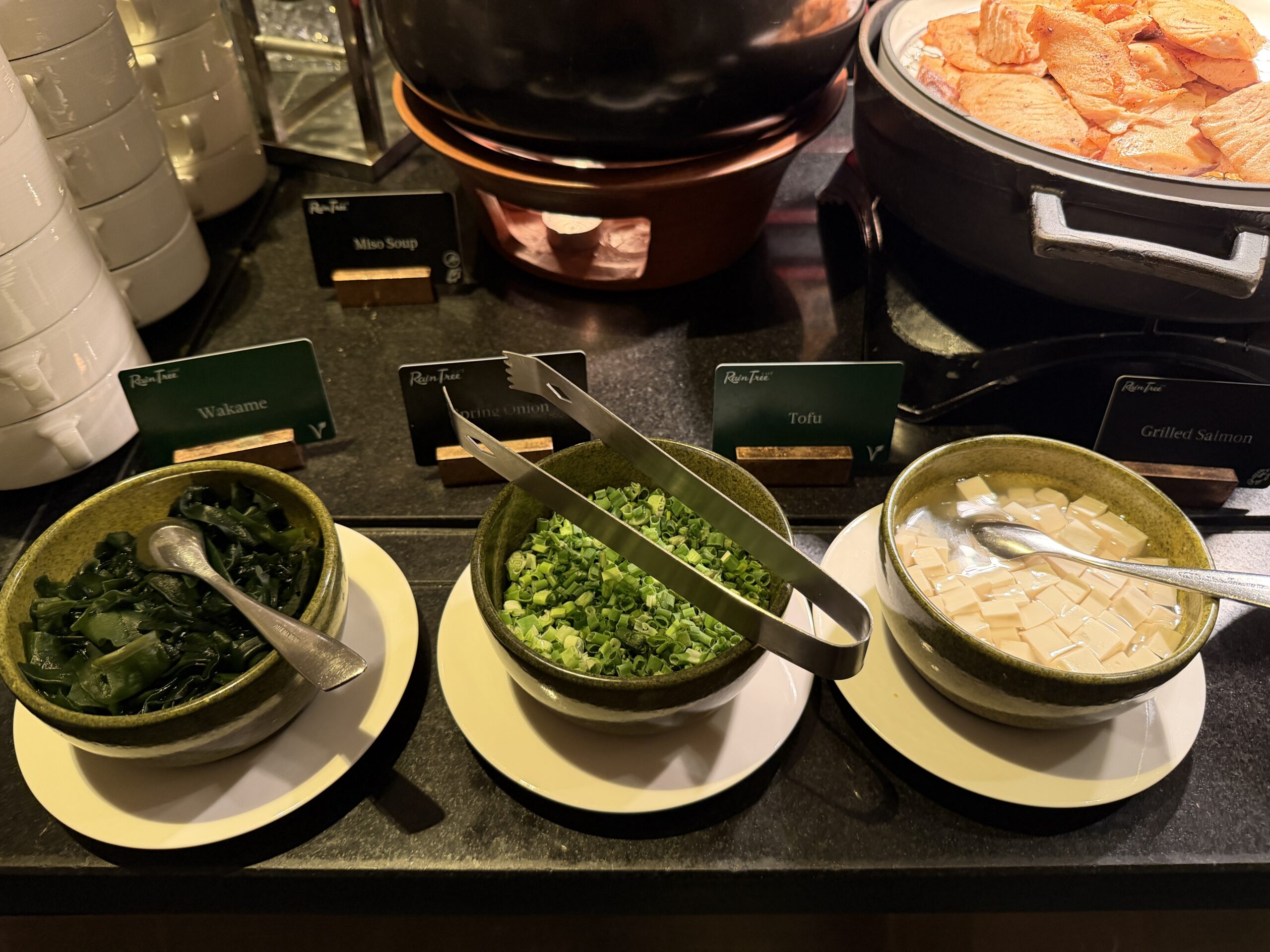 The Japanese corner offers miso soup with wakame, tofu, and spring onions, grilled salmon, steamed rice, and a few types of pickles. It’s a nice lighter option if you’re in the mood for something savoury but not too heavy.