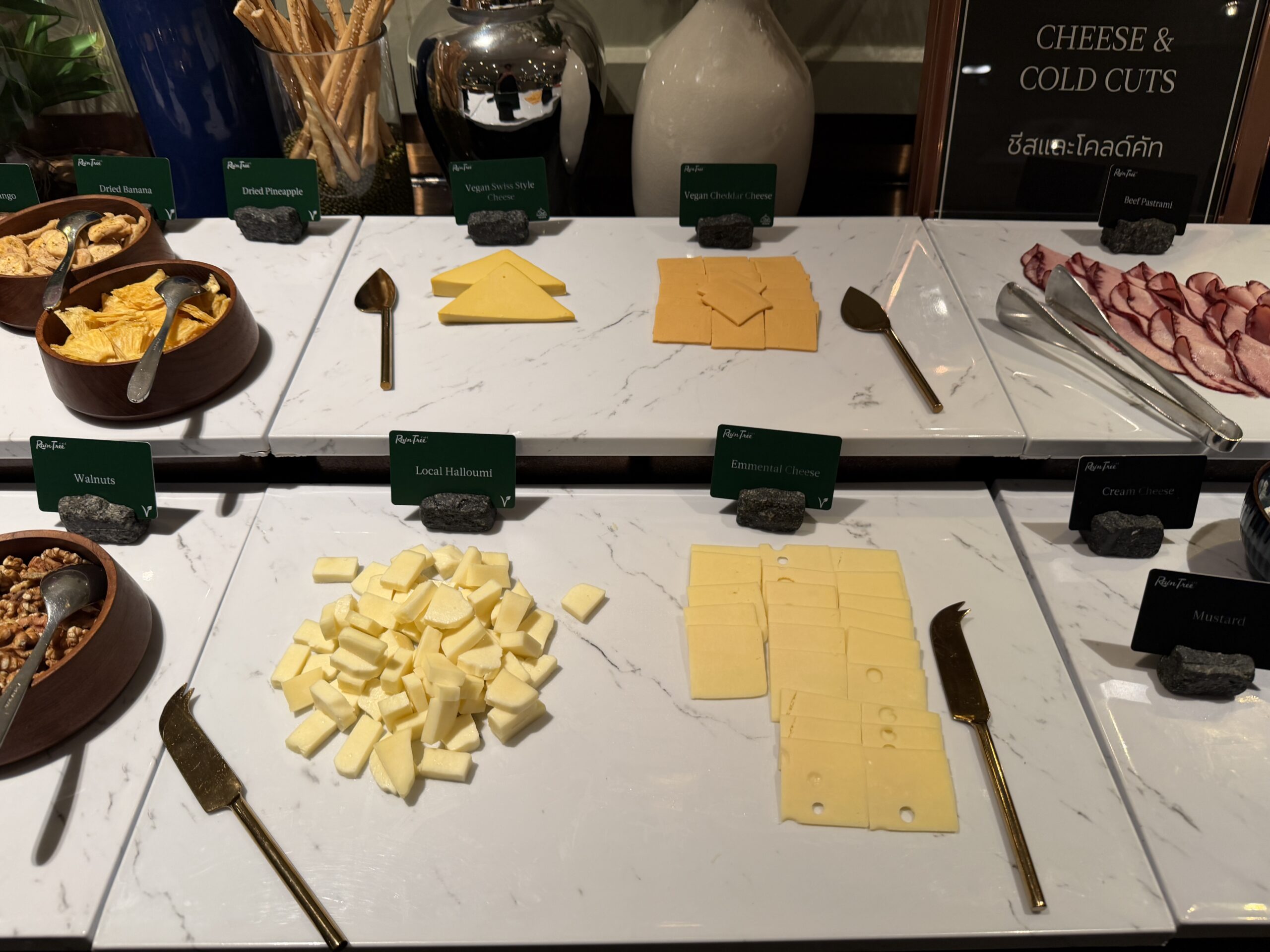 Just off the bakery corner, there’s a generous cheese and cold cut station. You’ll find sliced Emmental, local halloumi, feta, and a couple of vegan cheese options, plus walnuts and dried fruit if you want to build a proper breakfast board.