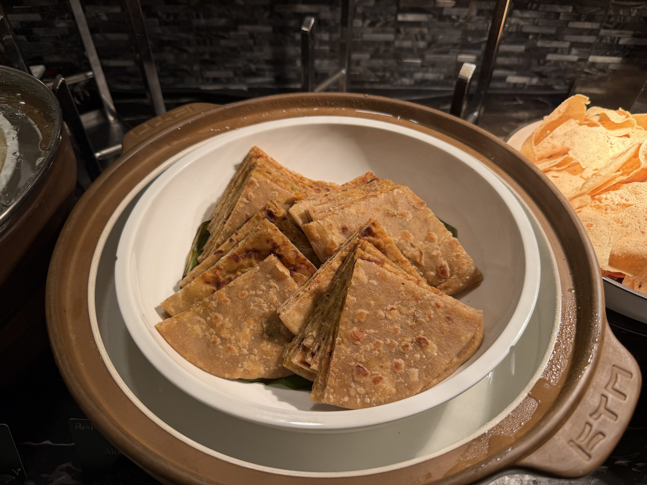 The Indian station is another highlight. During my stay, there was pav bhaji with soft bread rolls, upma, aloo paratha, and a side of papadum. Mango chutney, mixed pickles, green chillies, and mint sauce are set out so you can dial up the spice as you please.