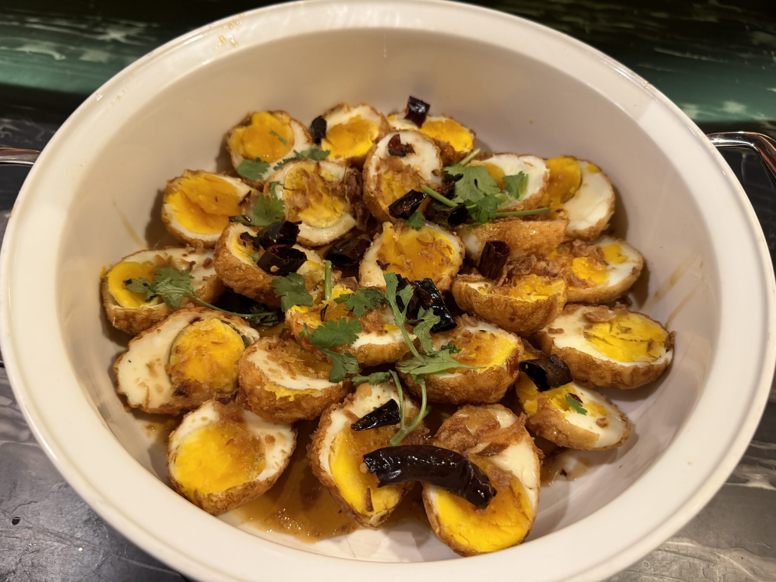 We began with Khao Kreap Goong—crisp, light prawn crackers served with a remarkably punchy, sweet-and-savory chili dip that set the tone for the bold flavours to follow.