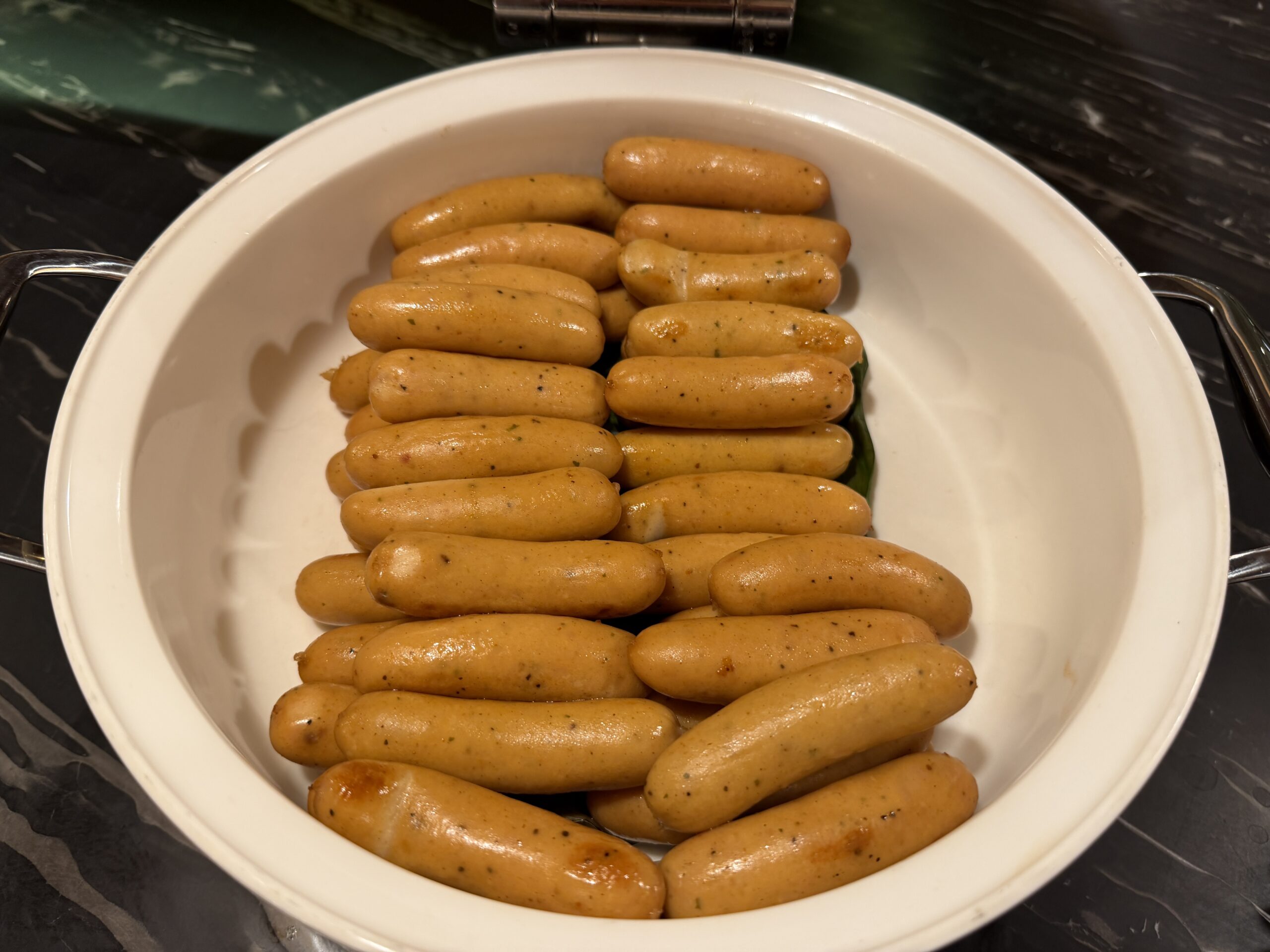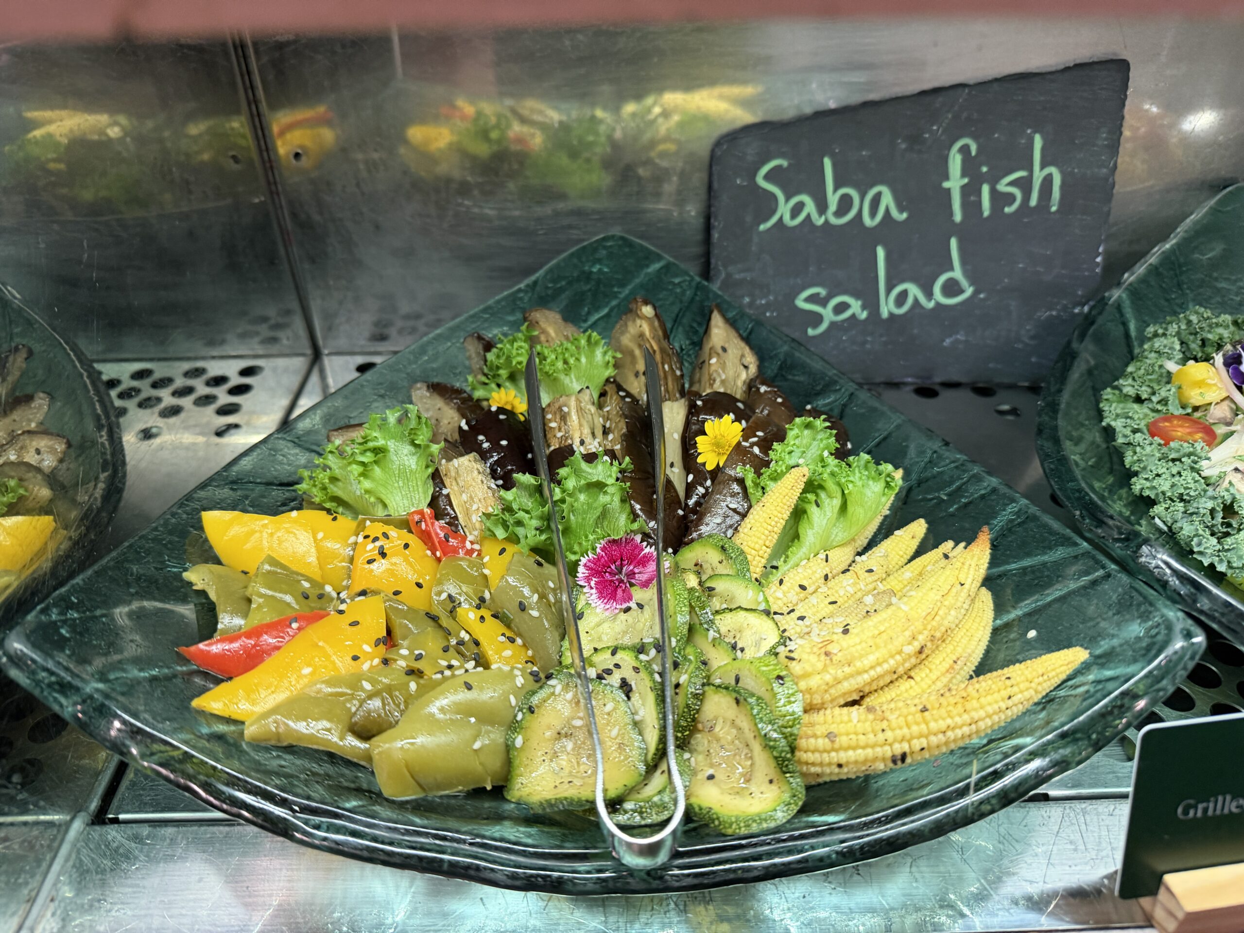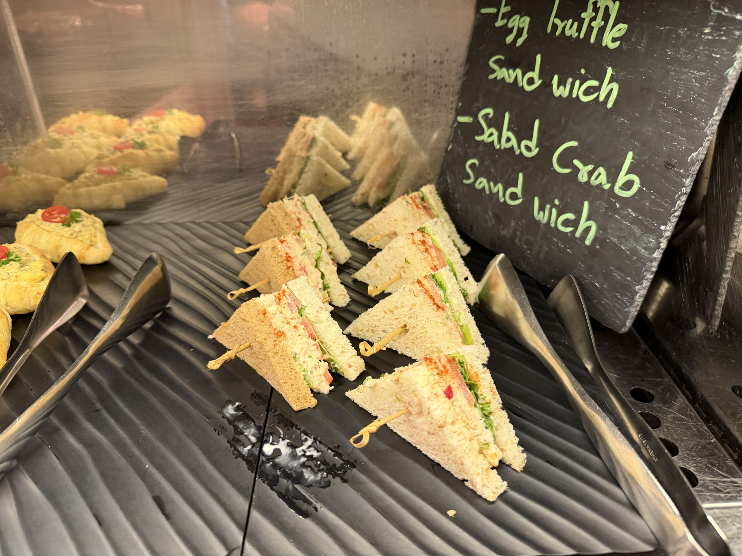 There’s a proper salad bar, grilled vegetables, quinoa salads, and plenty of cold items to start, alongside small sandwiches and shrimp sliders on charcoal buns. A cheese board, fresh fruit, and bite-sized desserts round things out if you’ve got a sweet tooth.